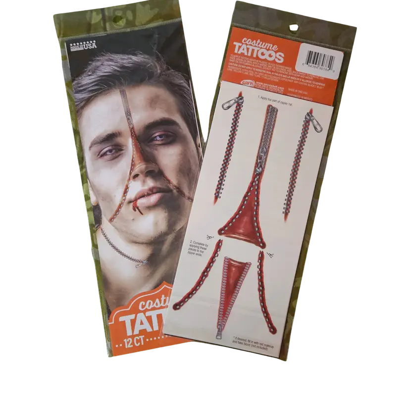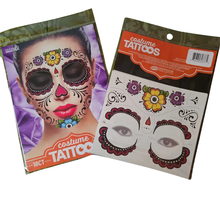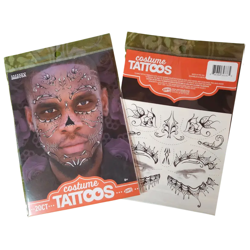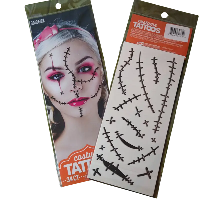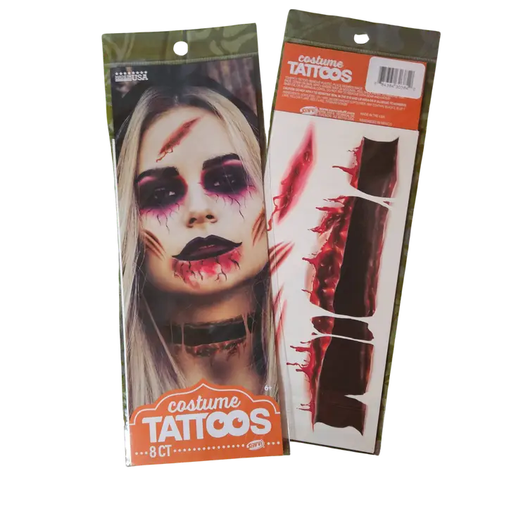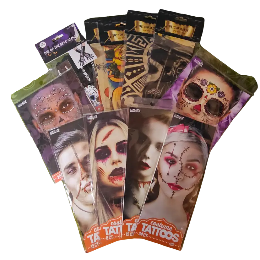 Lot of NEW SEALED Assorted Temporary Tattoos ⦁ Includes: ⦁ 4 Tattoo Sleeves (arm covers with printed designs) ⦁ 1 Tattoo Glove (hand/arm printed design) ⦁ 6 Face Tattoos (bloody stitches style & decorative face tattoos) ⦁ Great for costumes, parties, cosplay, or Halloween ⦁ Easy to apply and remove ⦁ Fun way to add a realistic tattoo look without the commitment