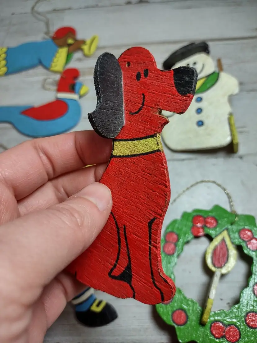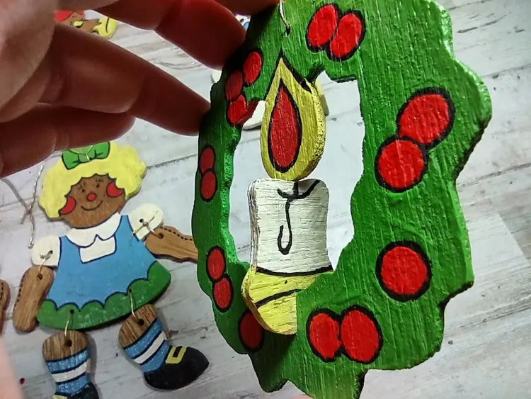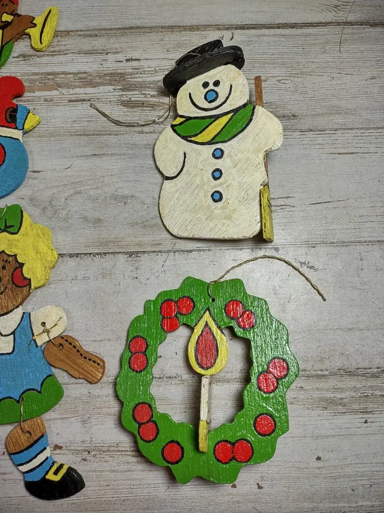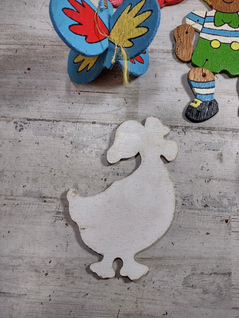 Used vintage condition with wear, scuffing, and paint chips. Hanger holes on goose and bells are broken off and missing. Angel wings are broken off and missing. Other pieces appear to be complete, but some wood sections are loose or cracked. See photos for more detail.