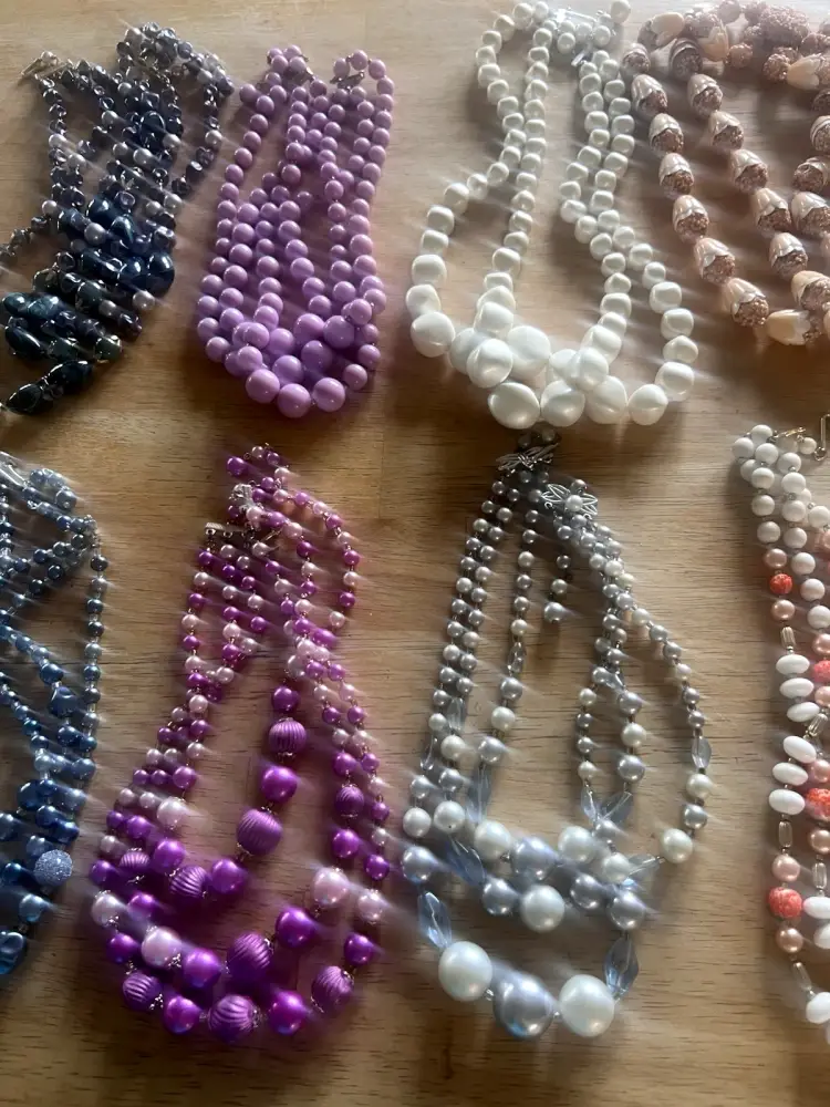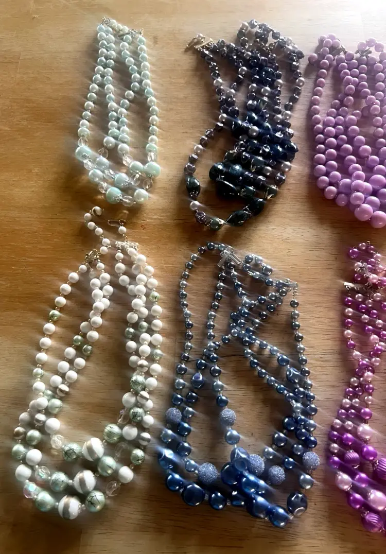 Description: Vintage Multi Strand Beaded Faux Pearl Necklace Lot of 12 9 are signed Japan 1 is signed Hong Kong 3 are unsigned Beautiful unique beads Great Estate Finds!
