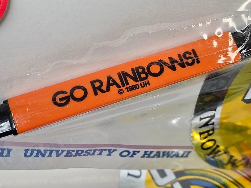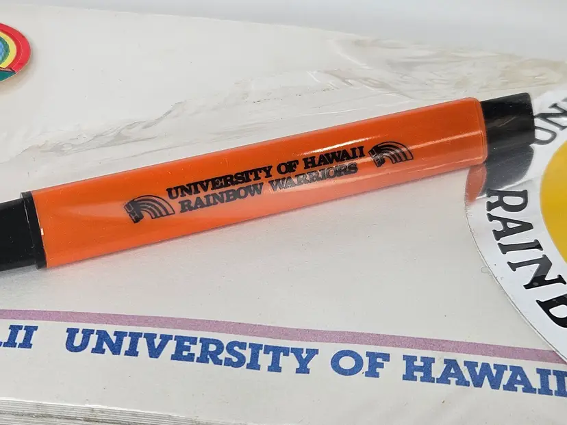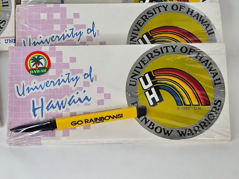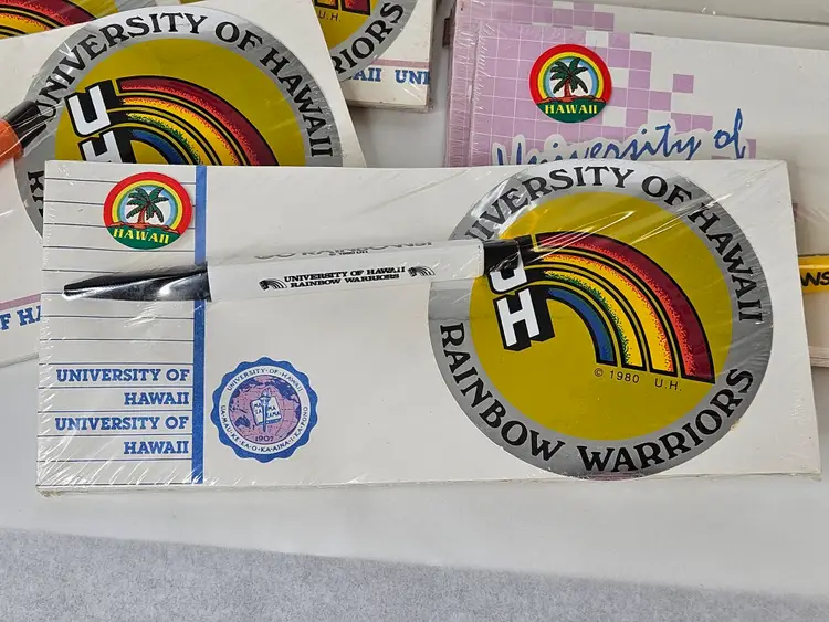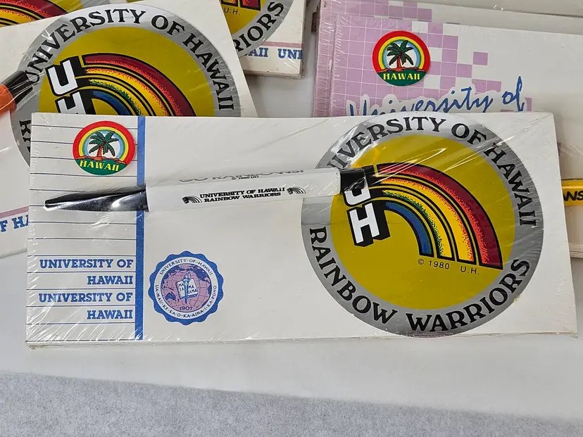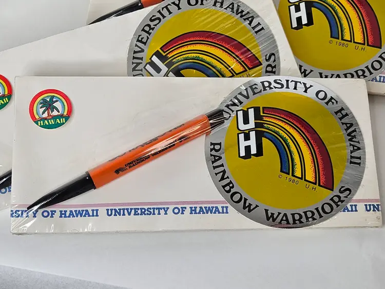 You are buying a lot of 12 University of Hawaii Rainbow Warriors Souvenir Set. Included is a triangle pen, shiny round sticker and some "Fan Mail" envelopes. These are sealed in plastic with many having the original price sticker on them. The pens may or may not work since they have been unused for 40 years. These are a cool, unique collectible item so get them while you can!