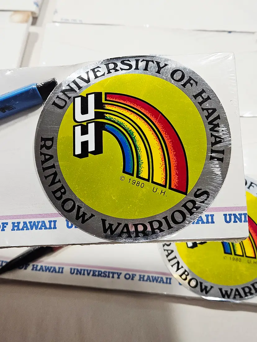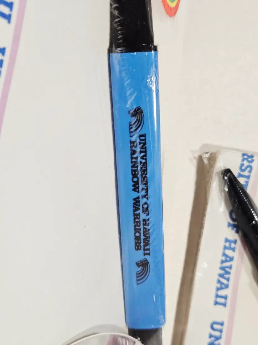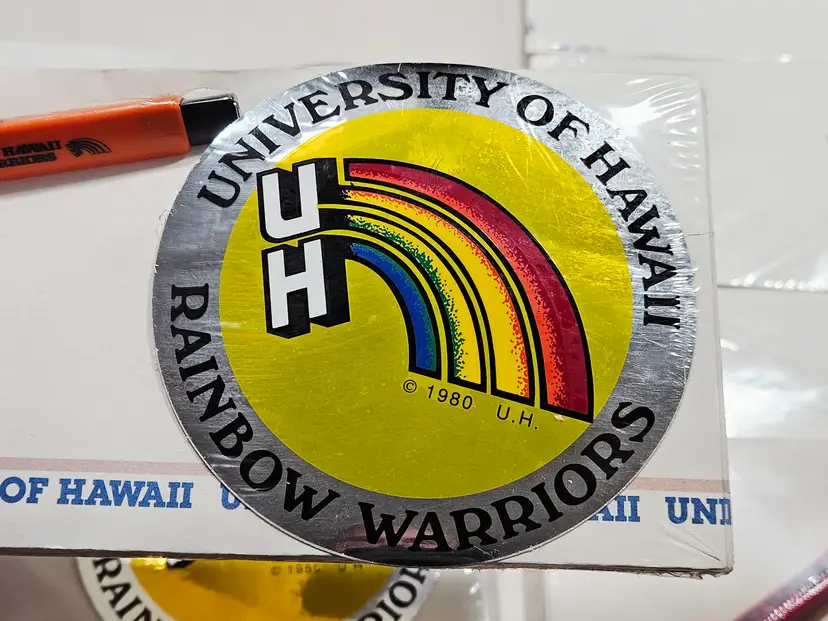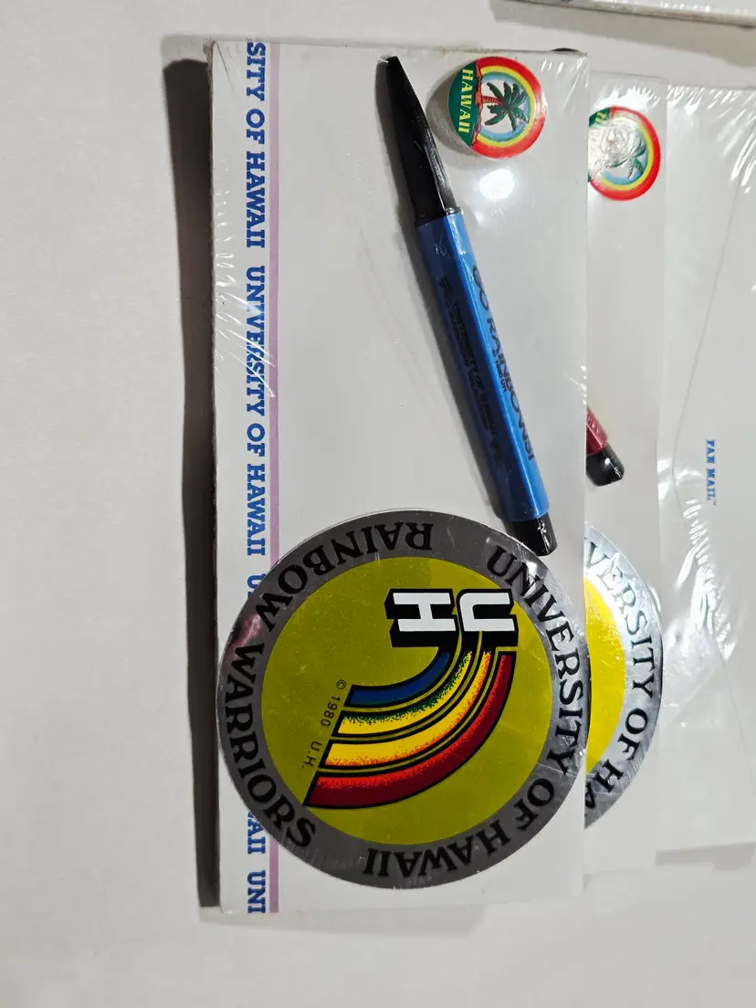 You are buying a lot of 12 University of Hawaii Rainbow Warriors Souvenir Set. Included is a triangle pen, shiny round sticker and some "Fan Mail" envelopes. These are sealed in plastic with many having the original price sticker on them. The pens may or may not work since they have been unused for 40 years. These are a cool, unique collectible item so get them while you can!