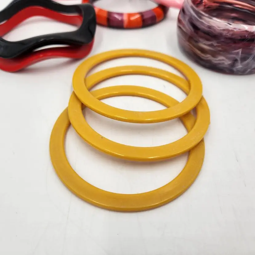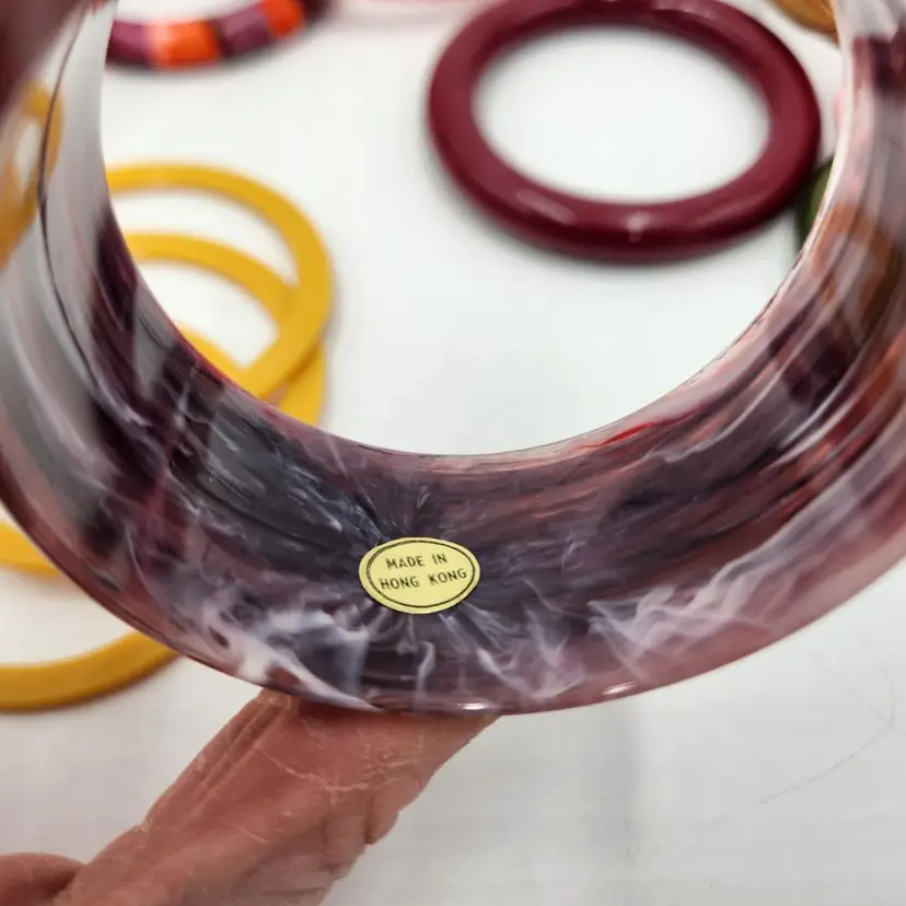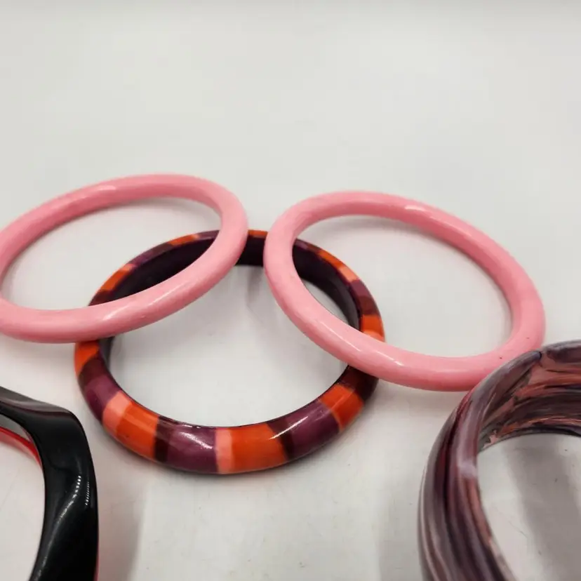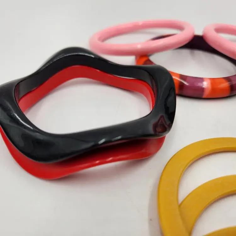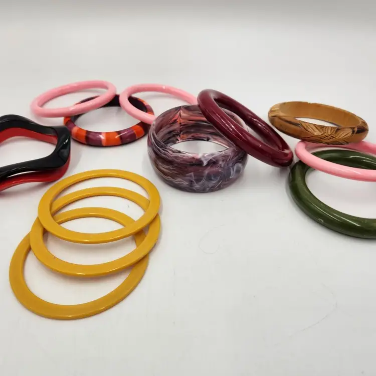 They are mixed. I know some are plastic and one is wood. I'm not positive if the one is Lucite and if the mustard colored ones are bakelite.