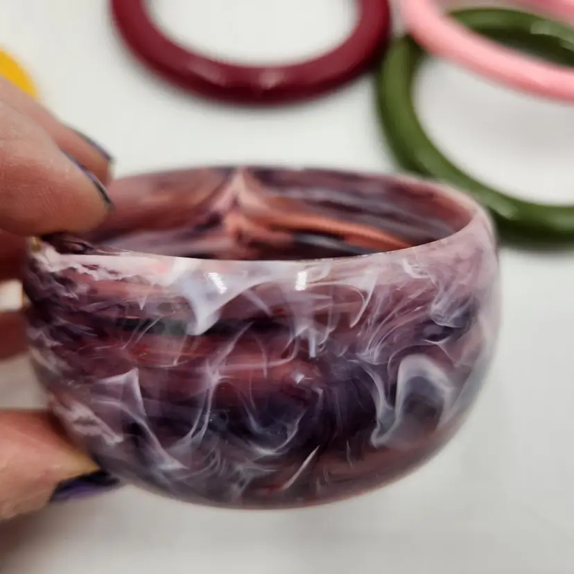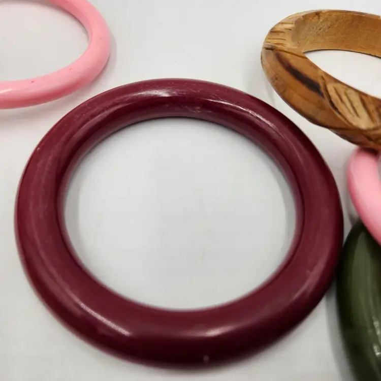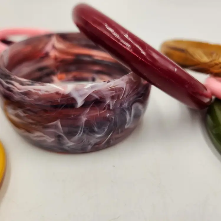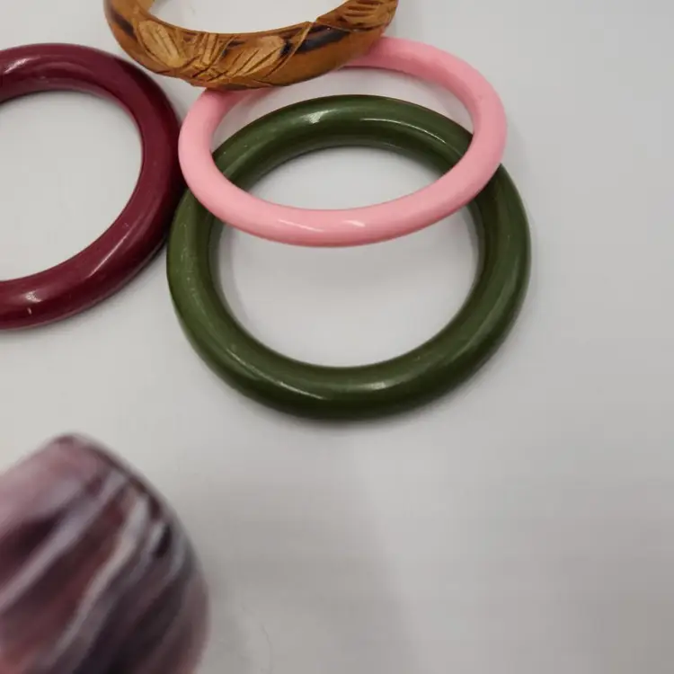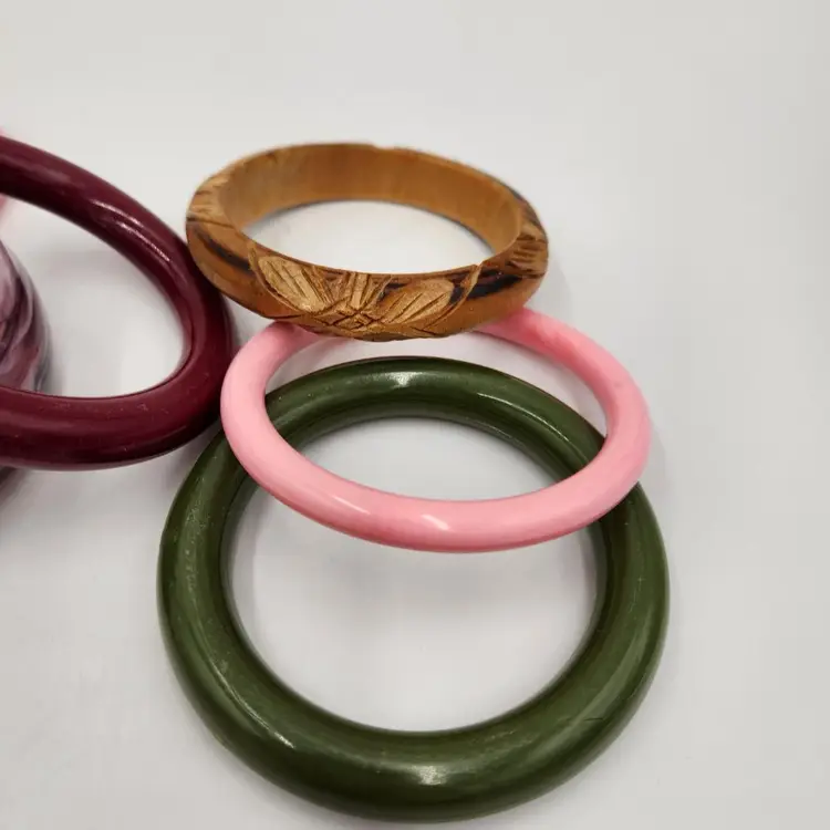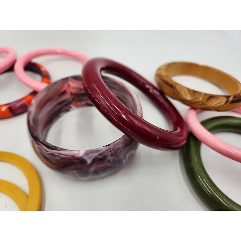 They are mixed. I know some are plastic and one is wood. I'm not positive if the one is Lucite and if the mustard colored ones are bakelite.