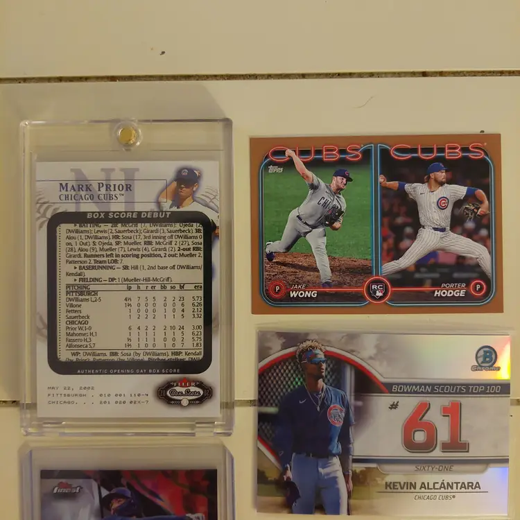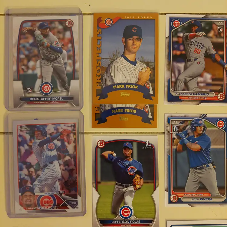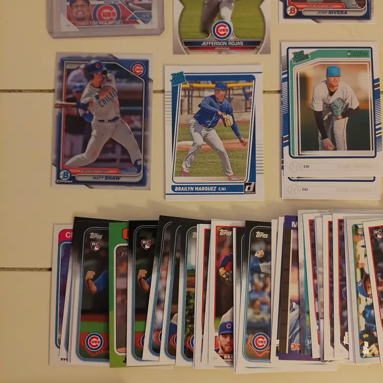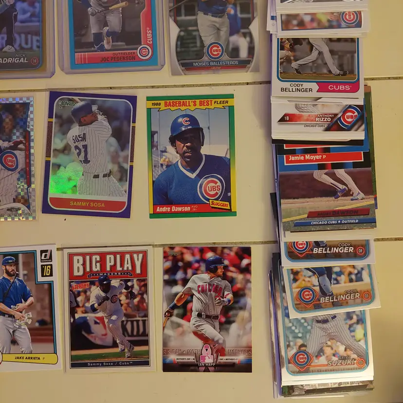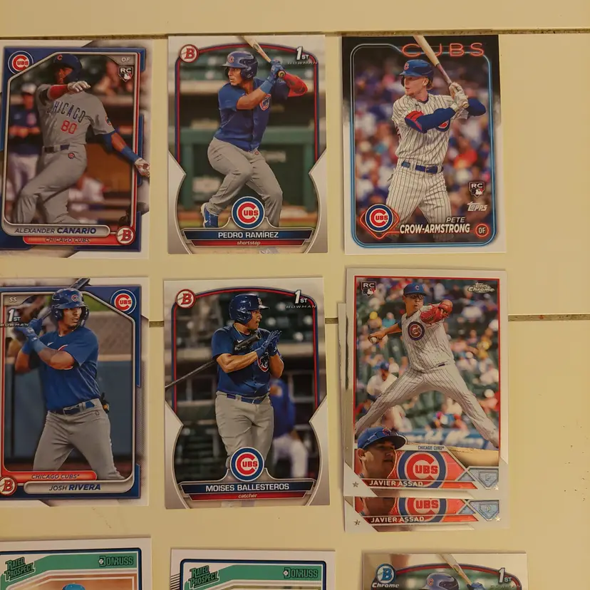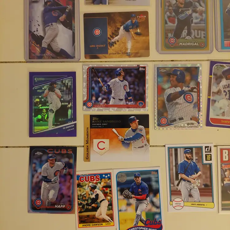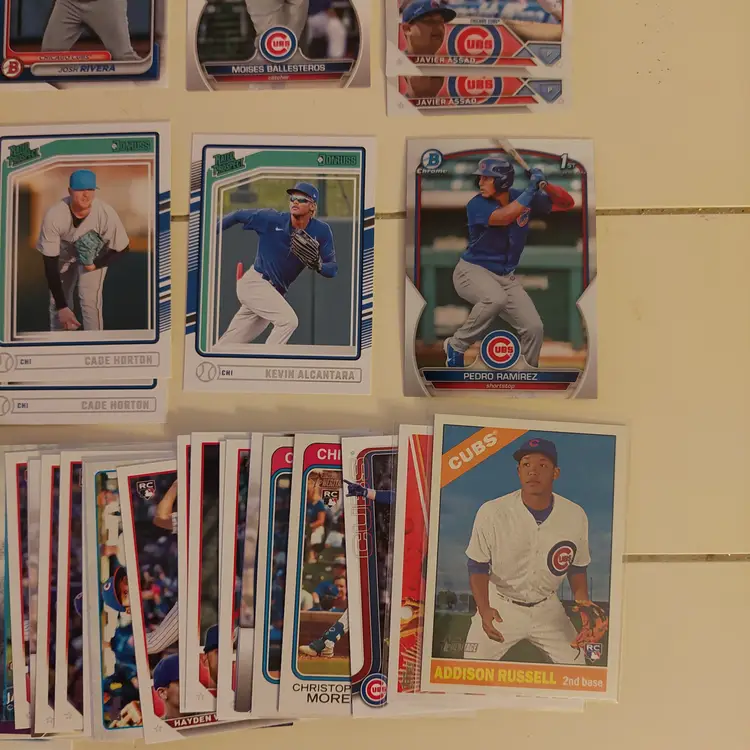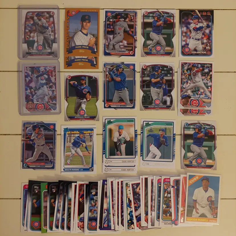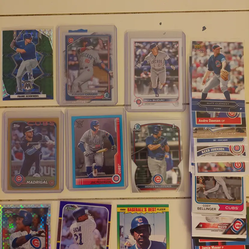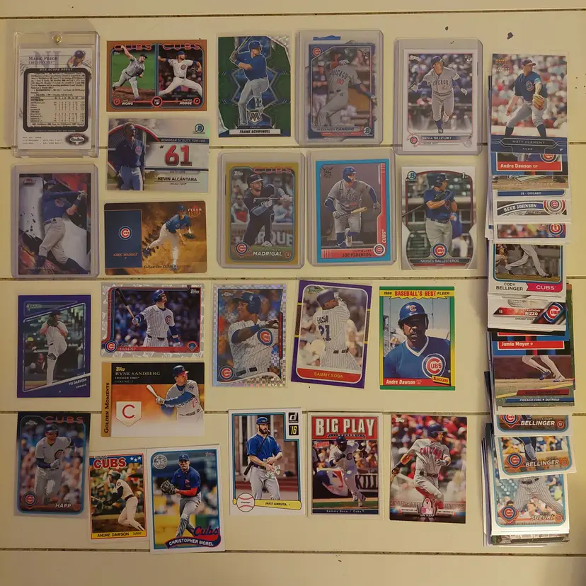 Players in the lot: Kevin Alcantara, Jake Arrieta, Javier Assad, Arismendy Alcantara. Michael Busch, Javier Baez, Moises Ballesteros, Cody Bellinger, Kris Bryant. Starlin Castro, Alexander Canario, Pete Crow-Armstrong, Tony Campana, Matt Clement. Yu Darvish, Andre Dawson. Mark Grace, Robel Garcia, Justin Grimm. Ian Happ, Brandon Hughes, Cade Horton. Shota Imanaga. Fergie Jenkins, Reed Johnson. Caleb Kilian. Luke Little. Greg Maddux, Christopher Morel, Nick Madrigal, Miles Mastrobuoni, Brailyn Marquez, Jamie Moyer. Joc Pederson, Daniel Palencia, Mark Prior Rafael Palmeiro. Anthony Rizzo, Hector Rondon, Addison Russell, Pedro Ramirez, Jefferson Rojas, Josh Rivera. Frank Schwindel, Sammy Sosa, Ryne Sandberg, Dansby Swanson, Matt Shaw, Rick Sutcliffe, Seiya Suzuki. Nelson Velazquez. Hayden Wesneski, Jordan Wicks, Kerry Wood.