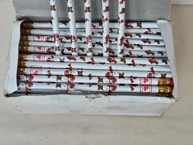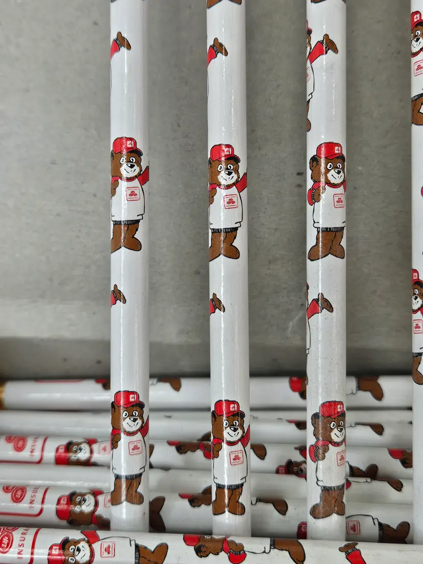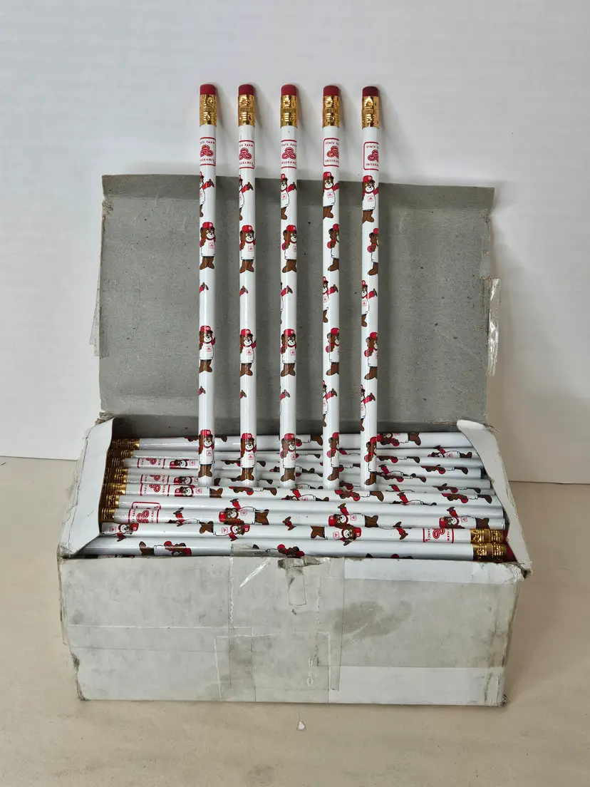 You are buying a lot of 150 vintage State Farm Insurance promo unsharpened wood pencils. It features Insurabear the State Farm Mascot from the 1970s & 1980s. These are nice collectible items for display. The erasers are hardened and brittle with some darker discoloration present from age and storage.