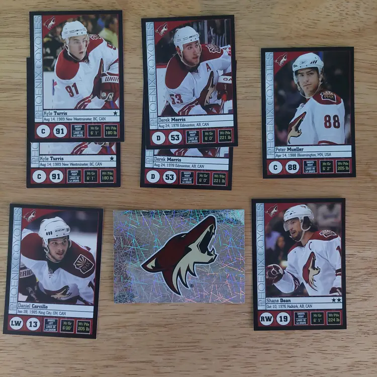 Stickers: Peter Mueller. Derek Morris. Kyle Turris. Shane Doan. Daniel Carcillo. Team logo.