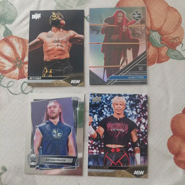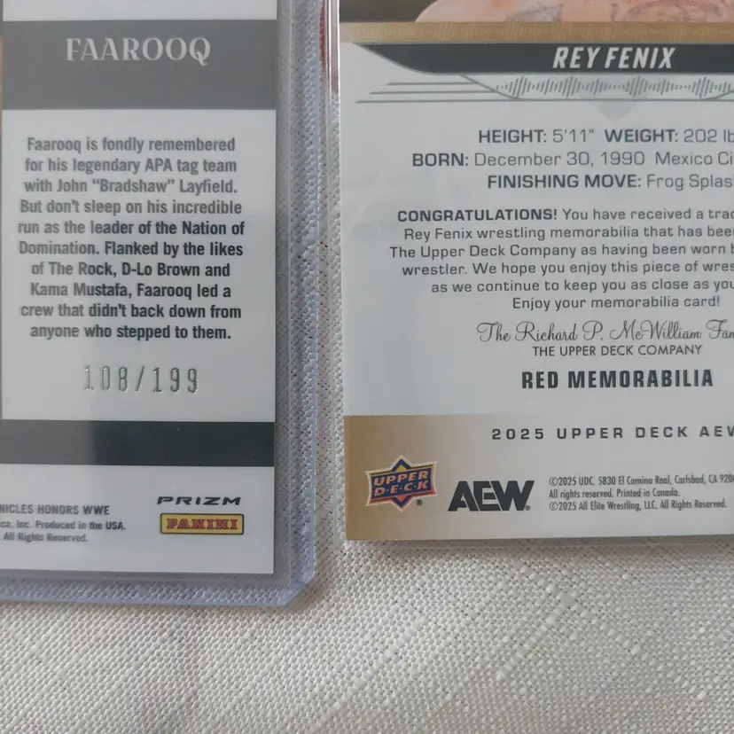 Rey Fenix 2025 Upper Deck AEW red memorabilia Parallel Relic. Faarooq 2023 Panini Chronicles Honors WWE #108/199. Nathan Frazer 2025 Topps Chrome WWE pink shimmer Parallel. Ric Flair 2023 Leaf Heroes of Wrestling yellow parallel. Card b-7.