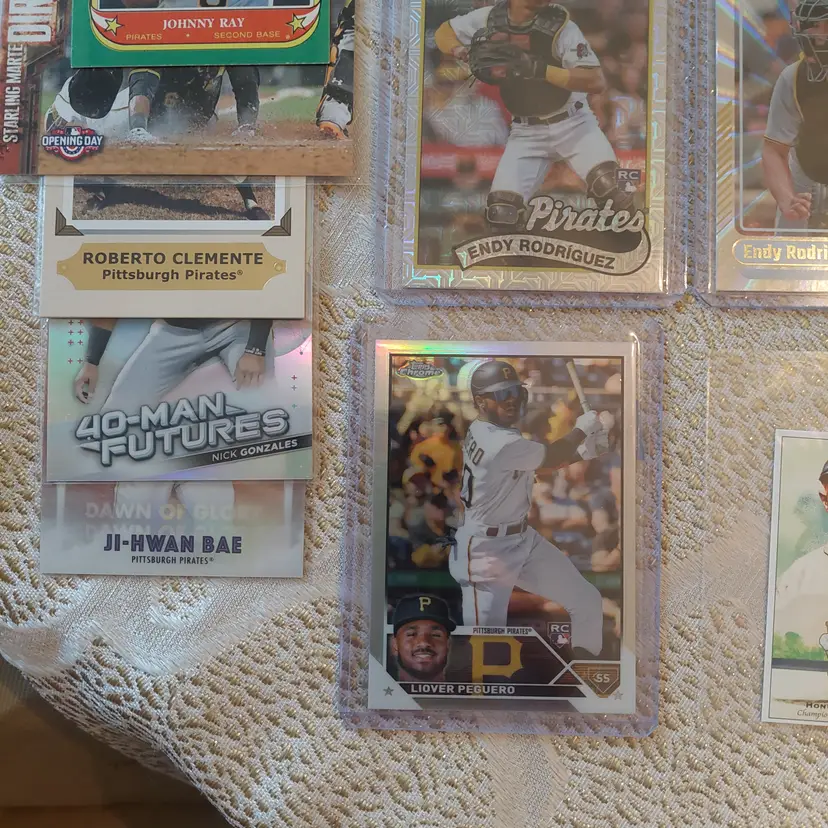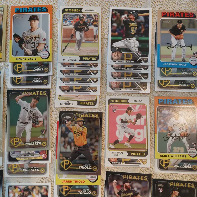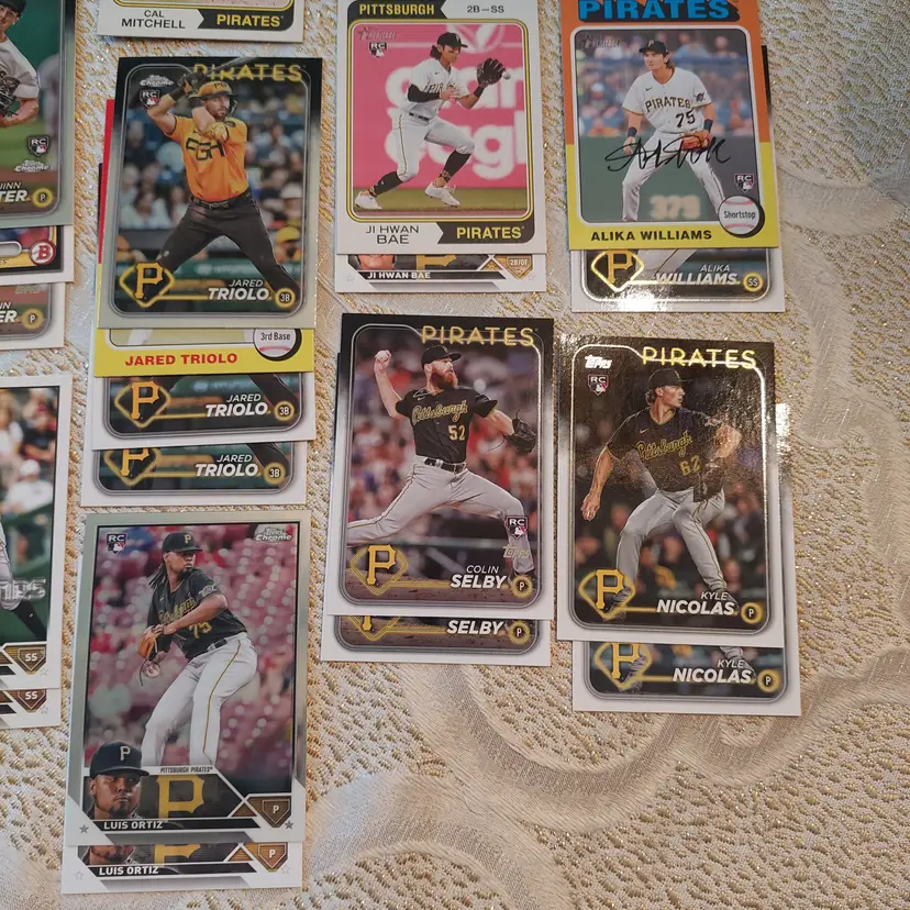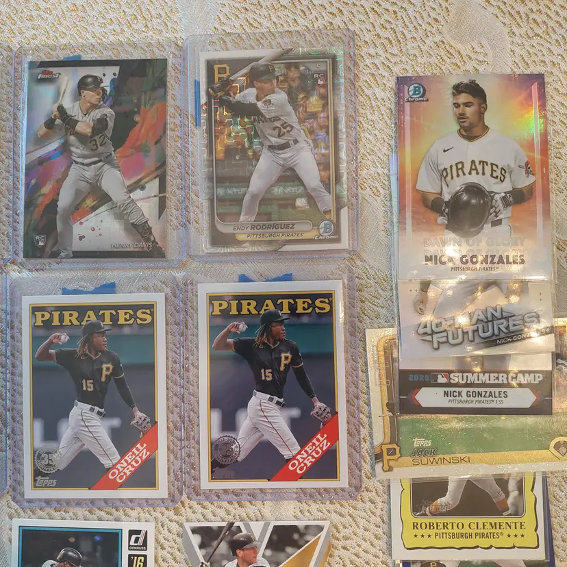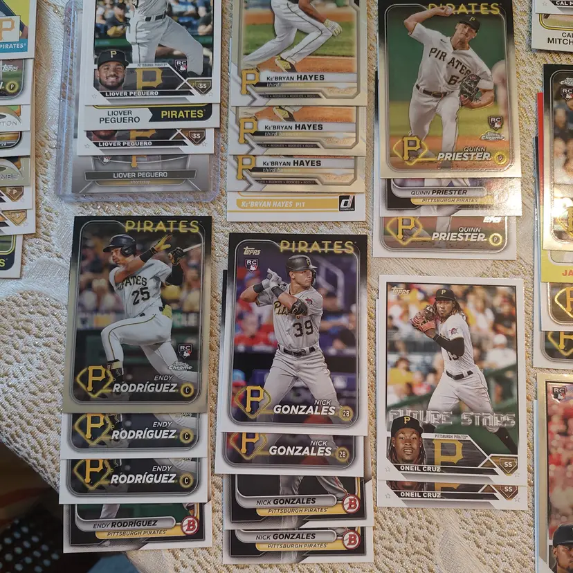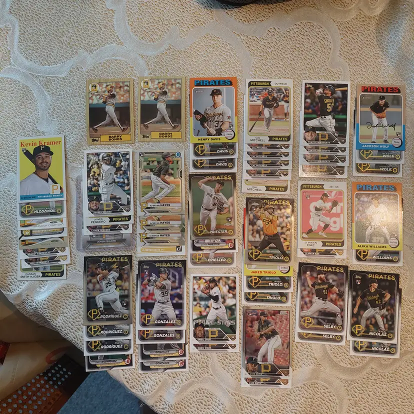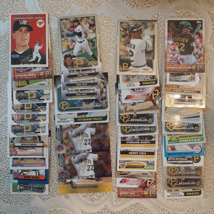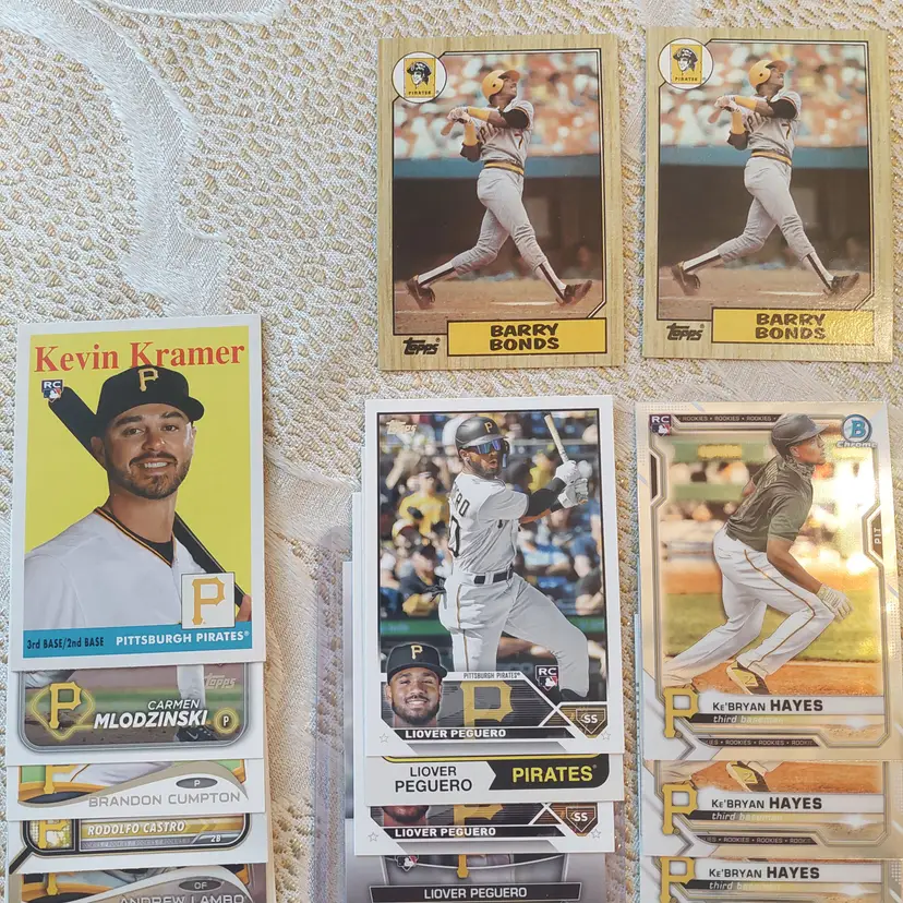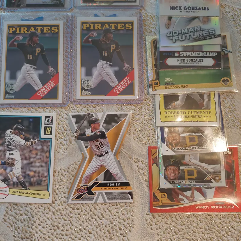 Players included in the lot: Ji-Hwan Bae, Barry Bonds, Jason Bay, Josh Bell, Tony Blanco, Jr.. Oneil Cruz, Roberto Clemente, Bubba Chandler, Rodolfo Castro, Po-Yu Chen, Roansy Contreras, Brandon Cumpton, Gerrit Cole. Henry Davis. Nick Gonzales. Ke'Bryan Hayes, Jose Hernandez. Termarr Johnson. Mitch Keller, Jason Kendall, Kevin Kramer. Andrew Lambo. Starling Marte, Andrew McCutchen, Alexander Mojica, Carmen Mlodzinski, Cal Mitchell, Jordy Mercer. Kyle Nicolas. Luis Ortiz. Shalin Polanco, Liover Peguero, Quinn Priester. Endy Rodriguez, Bryan Reynolds, Wandy Rodriguez, Johnny Ray. Jack Suwinski, Willie Stargell, Canaan Smith-Njigba, Estuar Suero, Travis Swaggerty, Colon Selby. Jared Triolo. Honus Wagner, Jackson Wolf, Alika Williams.