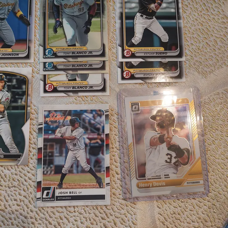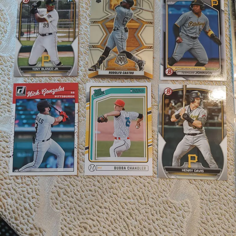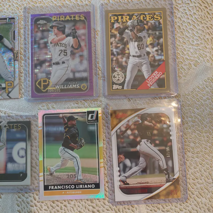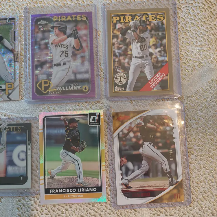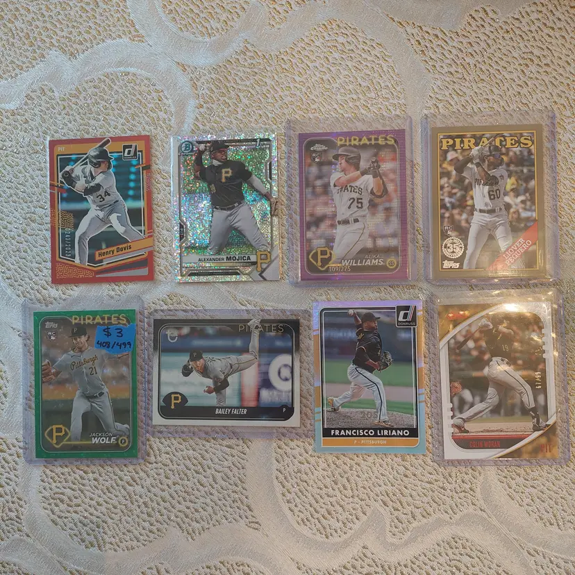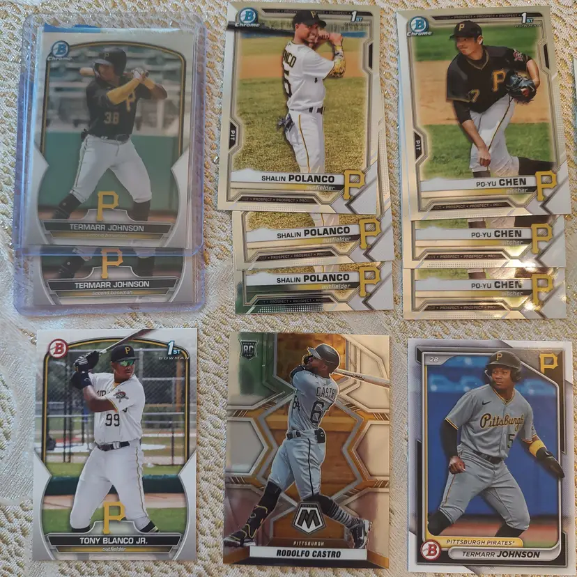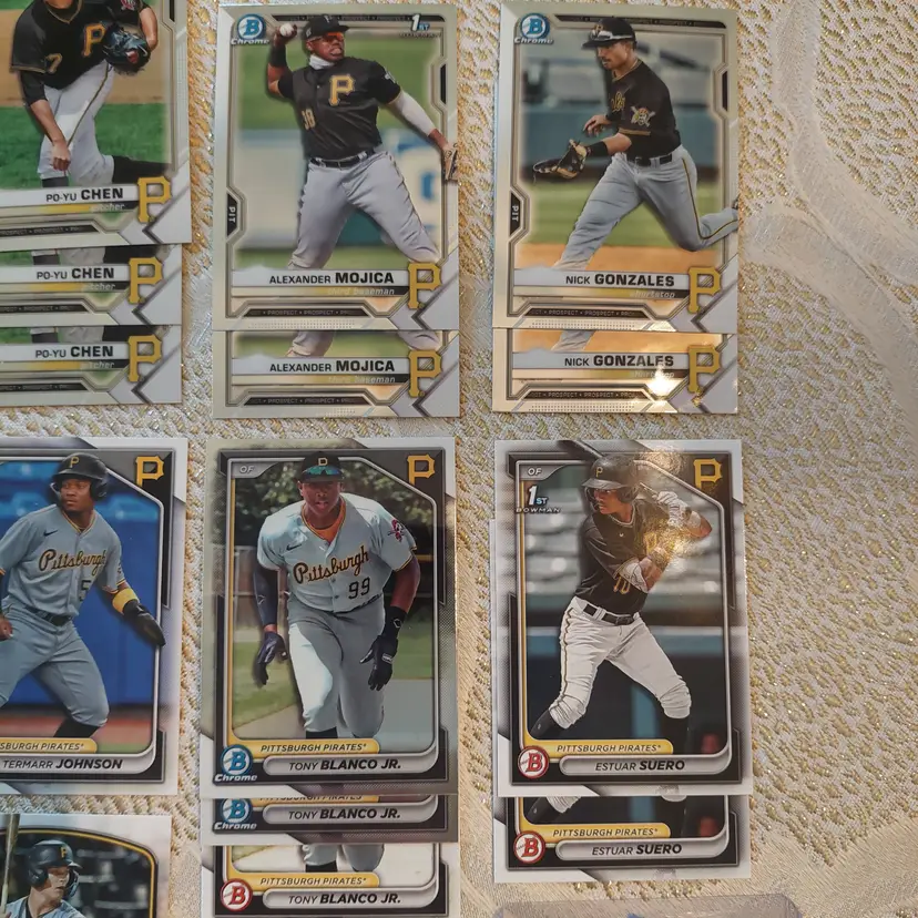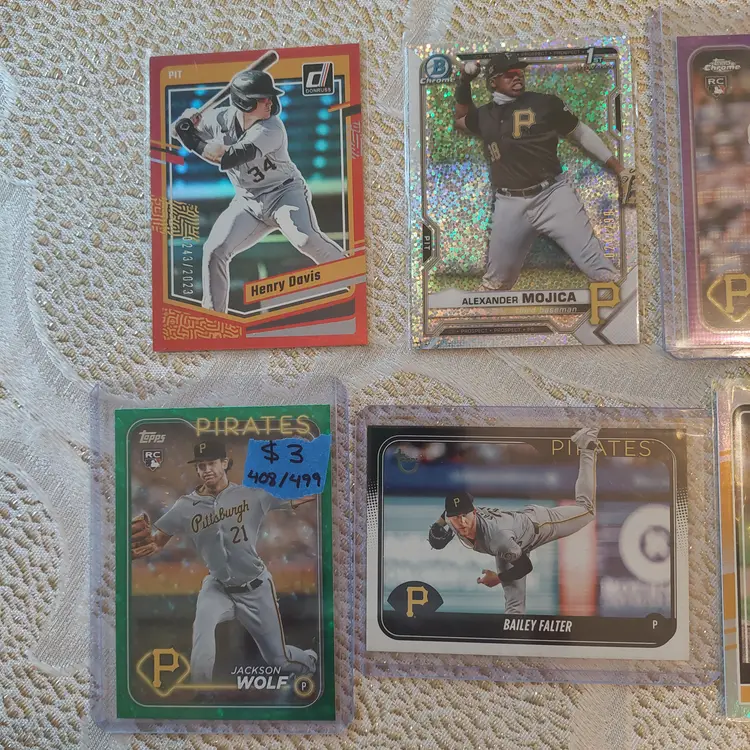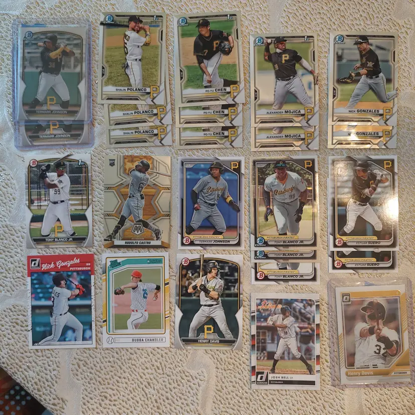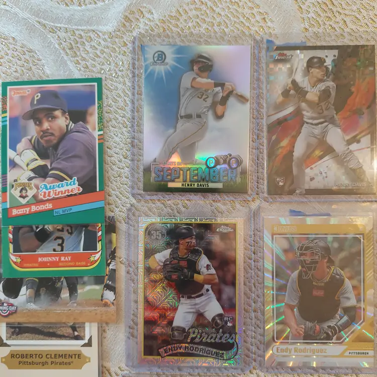 Players included in the lot: Ji-Hwan Bae, Barry Bonds, Jason Bay, Josh Bell, Tony Blanco, Jr.. Oneil Cruz, Roberto Clemente, Bubba Chandler, Rodolfo Castro, Po-Yu Chen, Roansy Contreras, Brandon Cumpton, Gerrit Cole. Henry Davis. Nick Gonzales. Ke'Bryan Hayes, Jose Hernandez. Termarr Johnson. Mitch Keller, Jason Kendall, Kevin Kramer. Andrew Lambo. Starling Marte, Andrew McCutchen, Alexander Mojica, Carmen Mlodzinski, Cal Mitchell, Jordy Mercer. Kyle Nicolas. Luis Ortiz. Shalin Polanco, Liover Peguero, Quinn Priester. Endy Rodriguez, Bryan Reynolds, Wandy Rodriguez, Johnny Ray. Jack Suwinski, Willie Stargell, Canaan Smith-Njigba, Estuar Suero, Travis Swaggerty, Colon Selby. Jared Triolo. Honus Wagner, Jackson Wolf, Alika Williams.