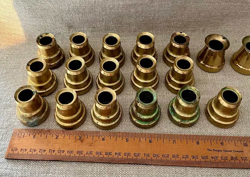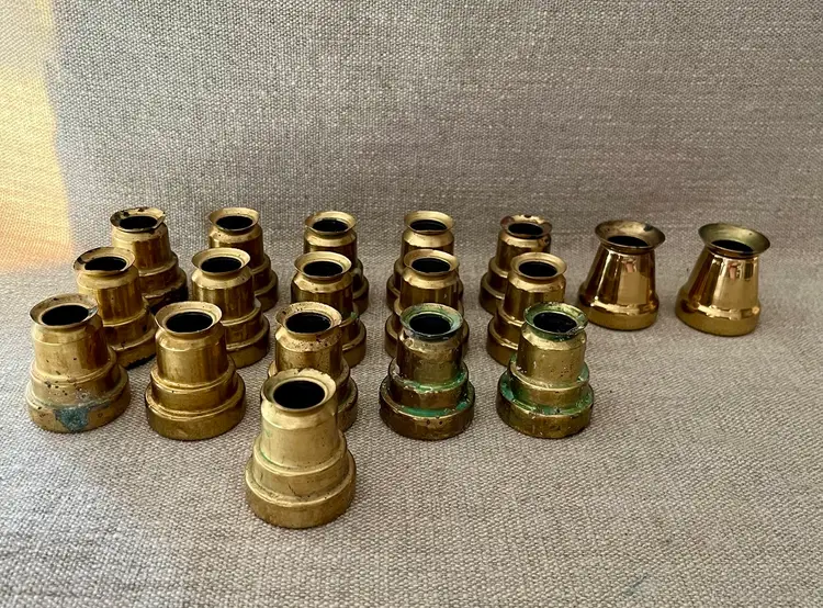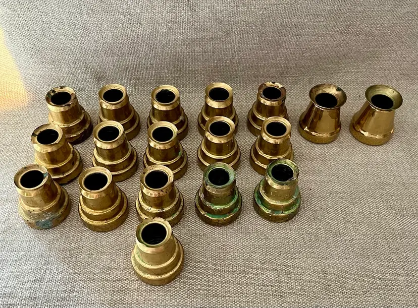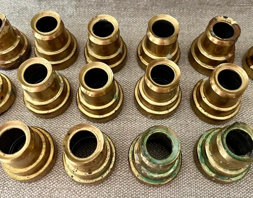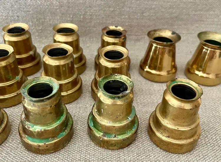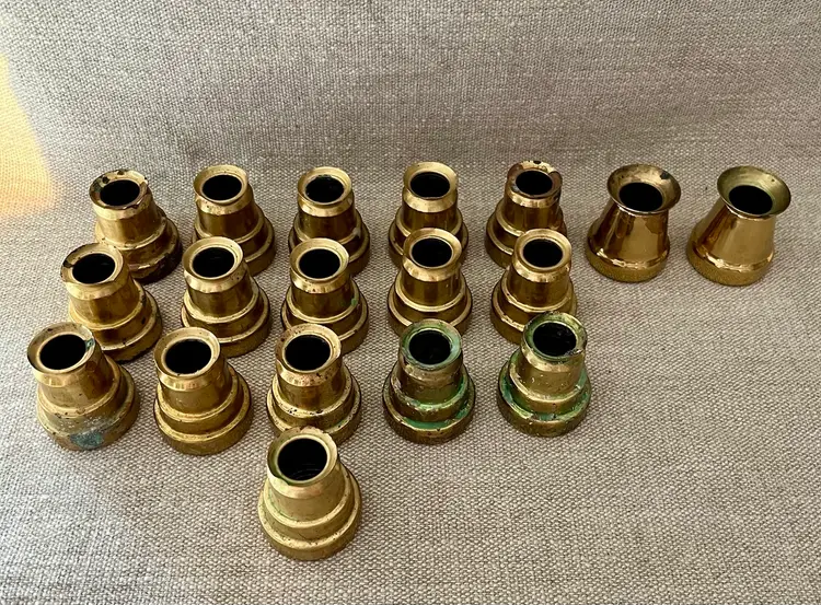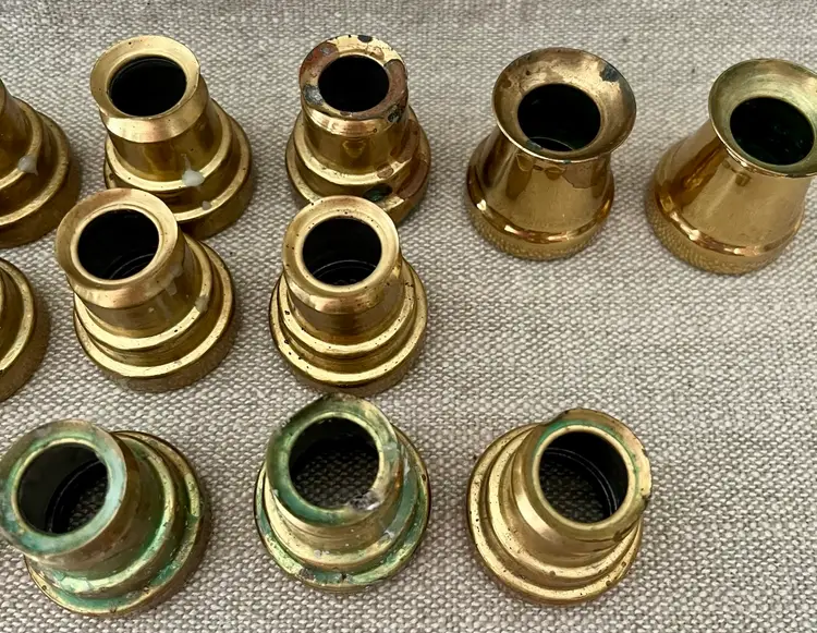 This is a set of 18 lacquered brass-plated candlestick followers in various sizes, suitable for 2" diameter candles. They are re-usable and feature a traditional style with a brass plated solid finish. These are perfect for a church or weddings. With a combined weight of (approximately) slightly over 2 pounds, these control the melt pool, allowing for a clean, even burn and protecting the candle flame from drafts. Specifically designed to fit 2-inch diameter candles, often used for thick chapel candles. As the candle burns, the follower rests on the rim, forcing the wax to consume itself rather than drip down the sides. Ideal for church candles, Advent candles, or home decor to keep candlestick holder bases clean.