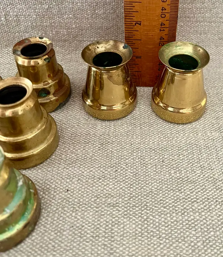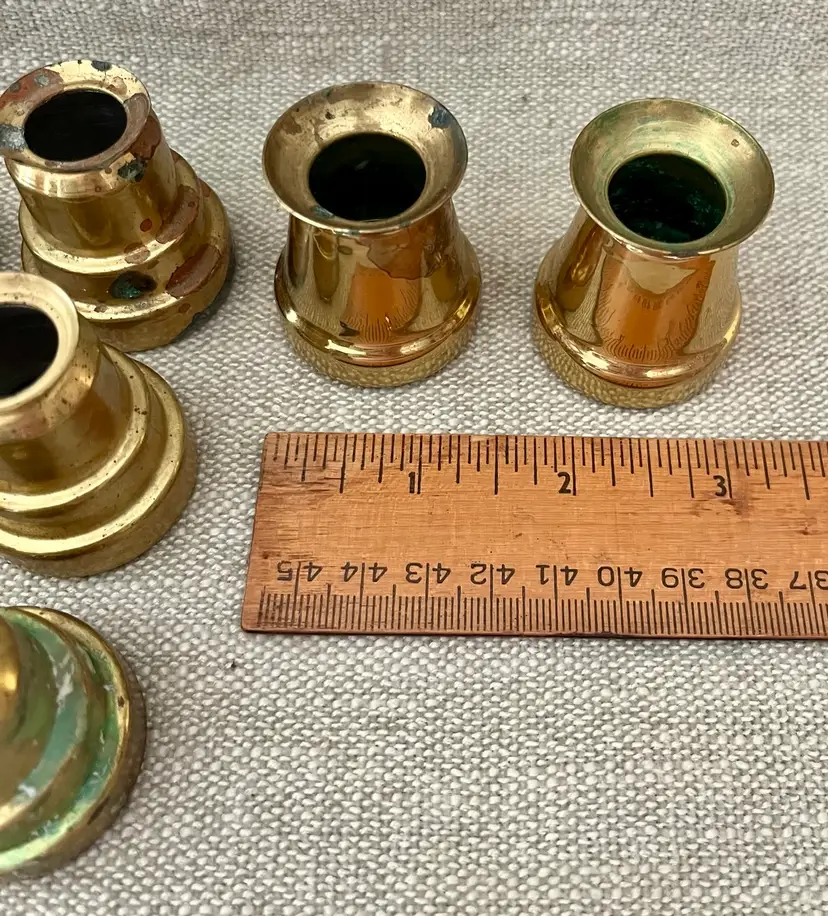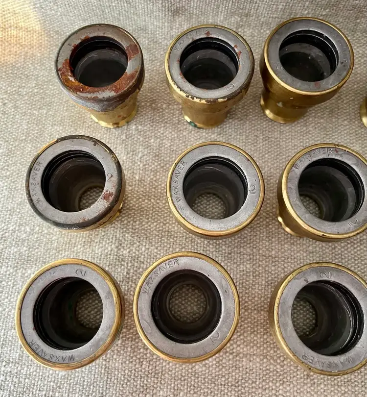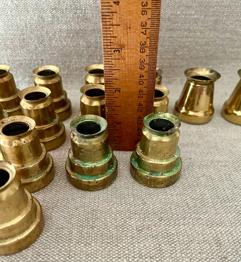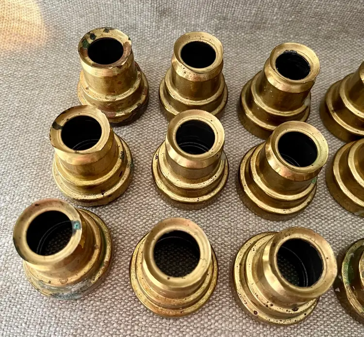 This is a set of 18 lacquered brass-plated candlestick followers in various sizes, suitable for 2" diameter candles. They are re-usable and feature a traditional style with a brass plated solid finish. These are perfect for a church or weddings. With a combined weight of (approximately) slightly over 2 pounds, these control the melt pool, allowing for a clean, even burn and protecting the candle flame from drafts. Specifically designed to fit 2-inch diameter candles, often used for thick chapel candles. As the candle burns, the follower rests on the rim, forcing the wax to consume itself rather than drip down the sides. Ideal for church candles, Advent candles, or home decor to keep candlestick holder bases clean.