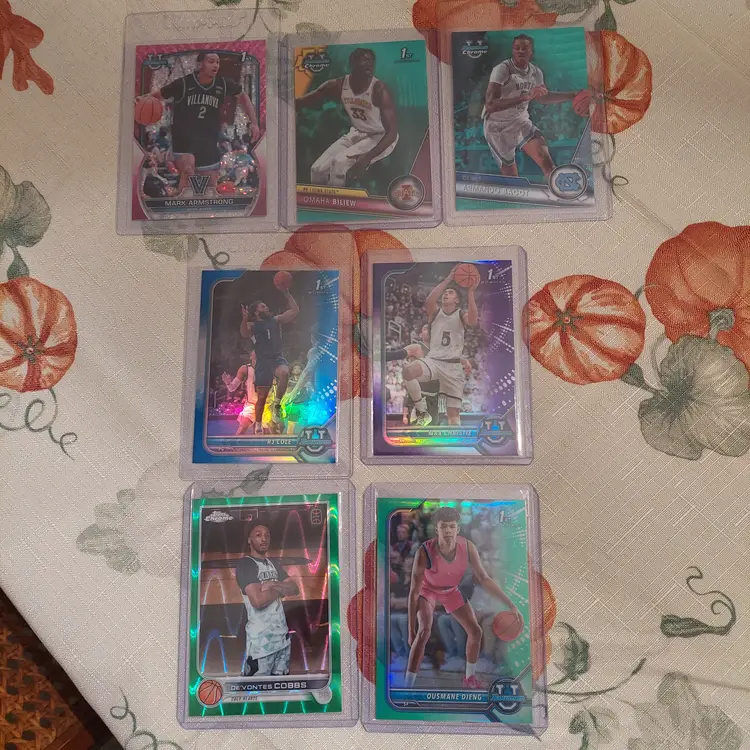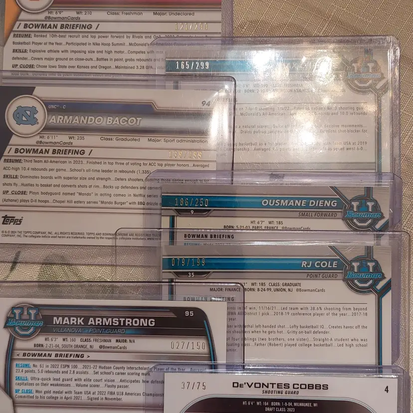 De'Vontes Cobbs #37/75. 2022-23 Topps Chrome OTE green raywave Parallel. Mark Armstrong #27/150. 2022-23 Bowman Chrome university fuchsia mini diamond Parallel. 1st Bowman. RJ Cole #79/199. 2021-22 Bowman Chrome university blue parallel. 1st Bowman. Ousmane Dieng #186/250. 2021-22 Bowman Chrome university aqua Parallel. 1st Bowman. Omaha Biliew #121/299. 2023-24 Bowman Chrome university aqua Parallel. 1st Bowman. Armando Bacot #138/299. 2023-24 Bowman Chrome university aqua wave Parallel. Max Christie #165/299. 2021-22 Bowman Chrome university purple Parallel. 1st Bowman.