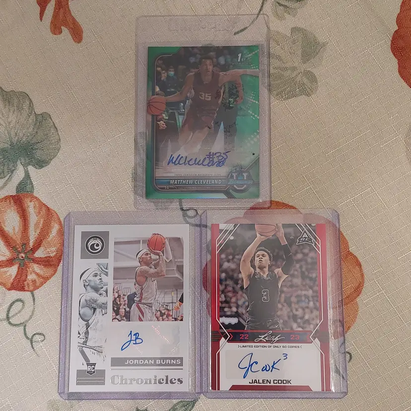 Jalen Cook auto. 2022-23 Leaf red Parallel. /50. Matthew Cleveland auto. #35/99. 2021-22 Bowman Chrome university green Parallel. Jordan Burns auto. 2021-22 Panini Chronicles draft picks.