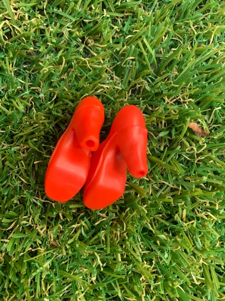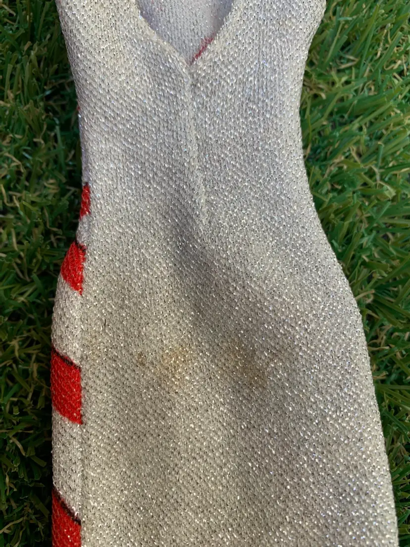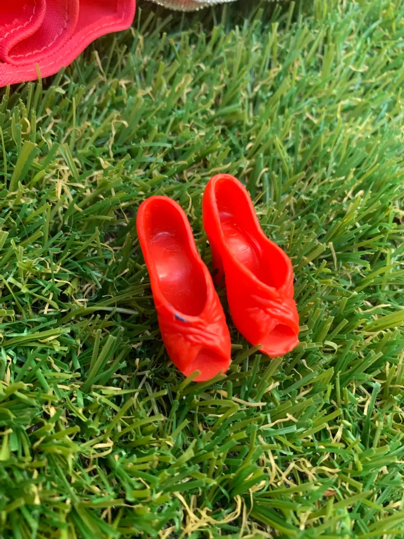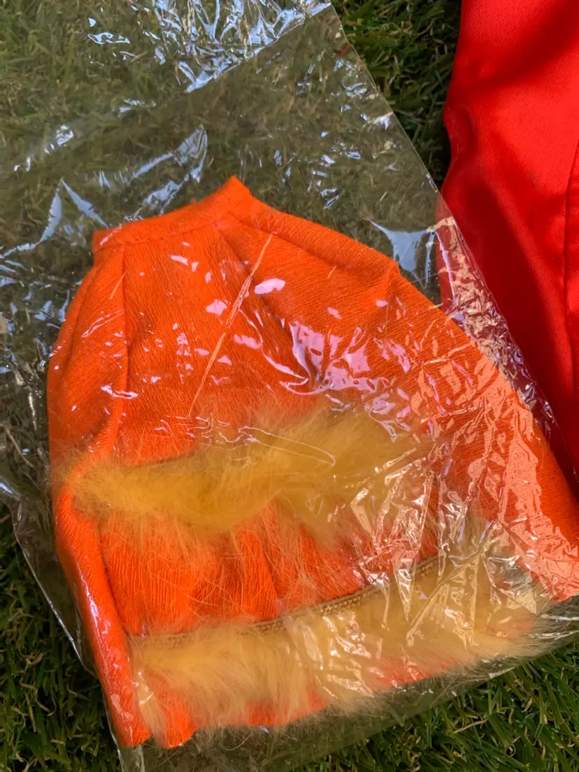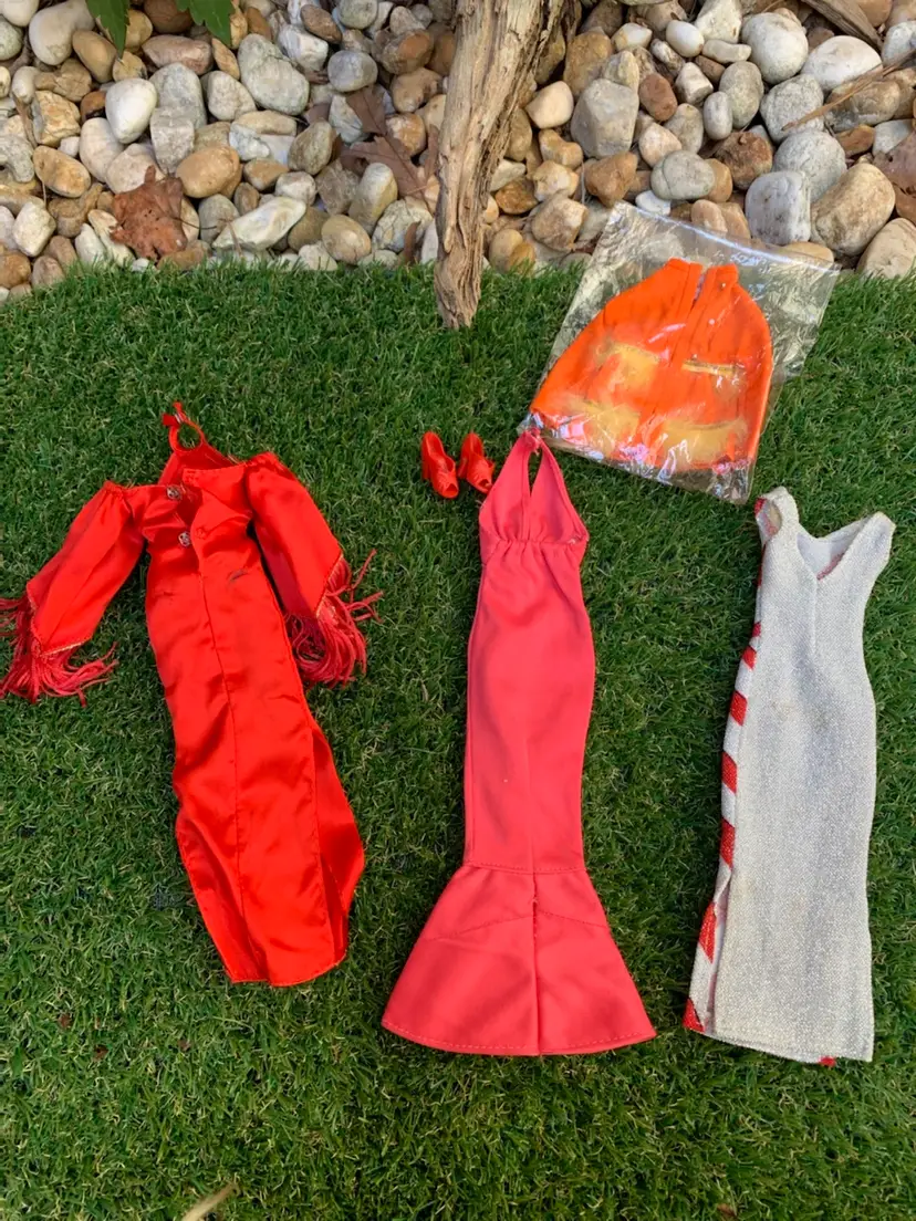 This lot includes 3 dresses, a jacket and pair of shoes. The jacket fur is starting to flake off and one “button” has lost its gold color. The dresses have a few flaws on the backs and some stitching is loose. One shoe has a black mark on toe. Please look closely at photos. Overall, a nice lot of pieces to add to your collection.