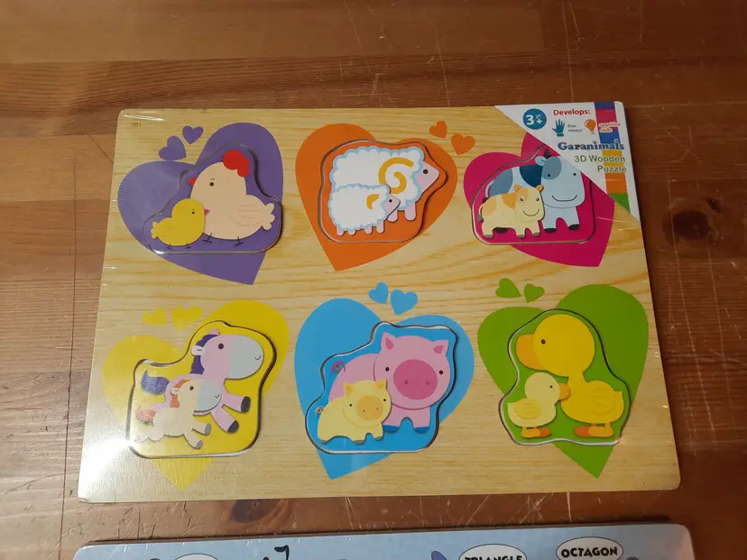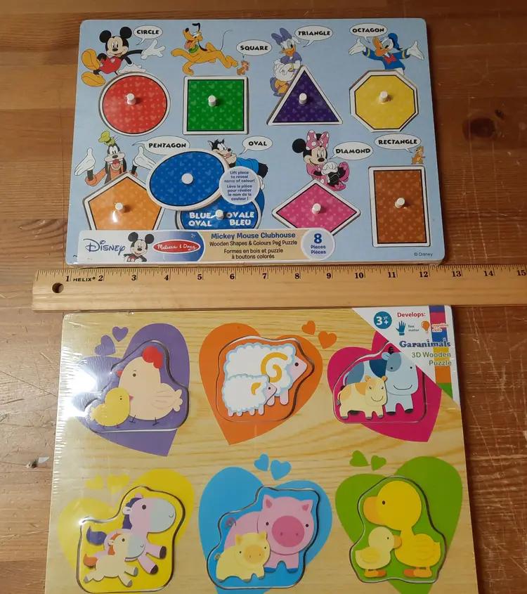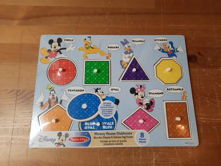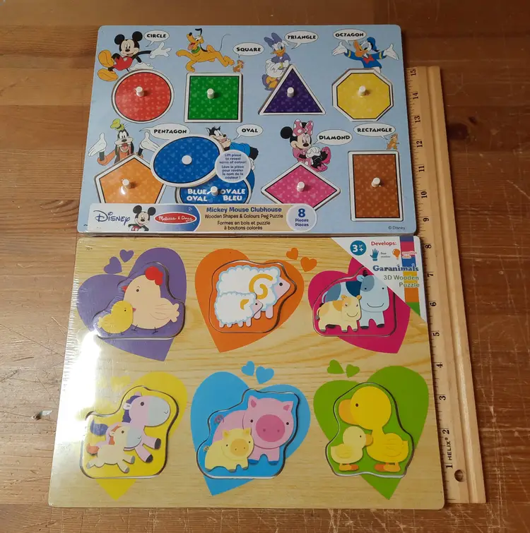 Lot of 2 Wooden Puzzles, New in Packaging. 1 is a melissa & doug disney Mickey Mouse Clubhouse Shapes and colors Peg Puzzle. The other is a Garanimals 3D wooden Puzzle of animals. see pics for more info. Thanks!