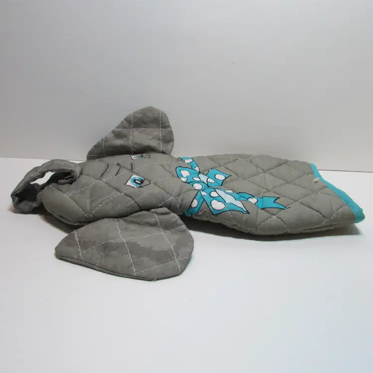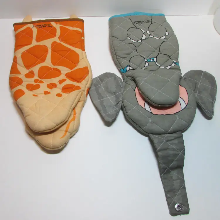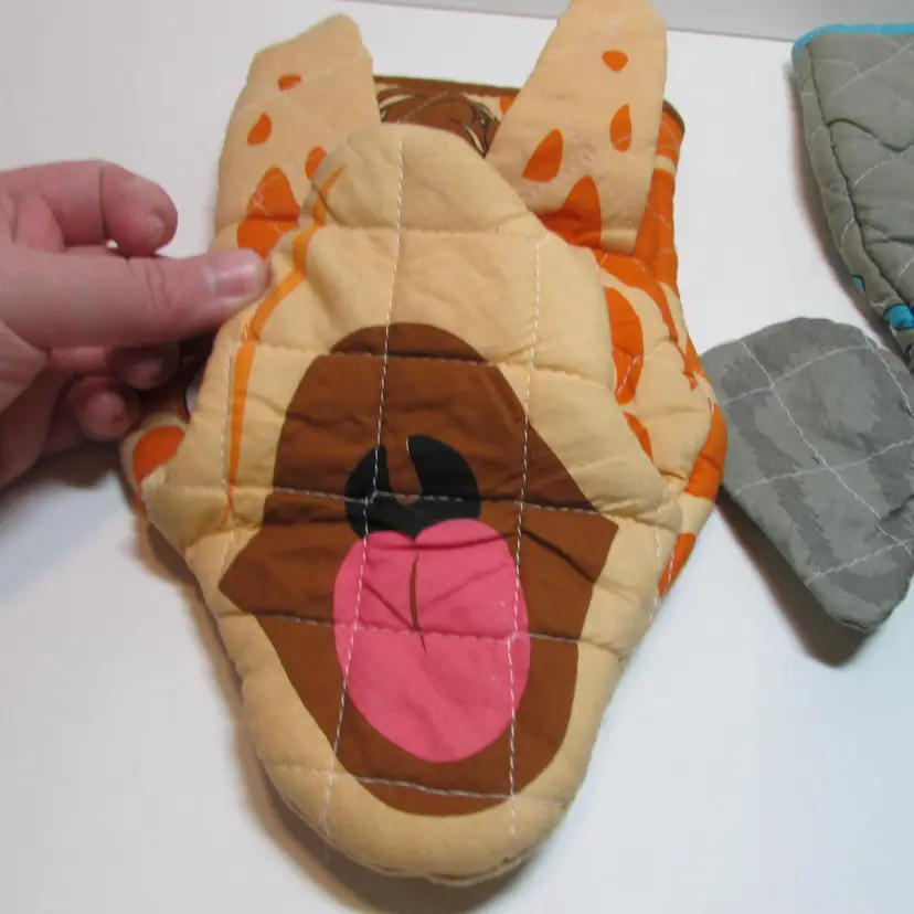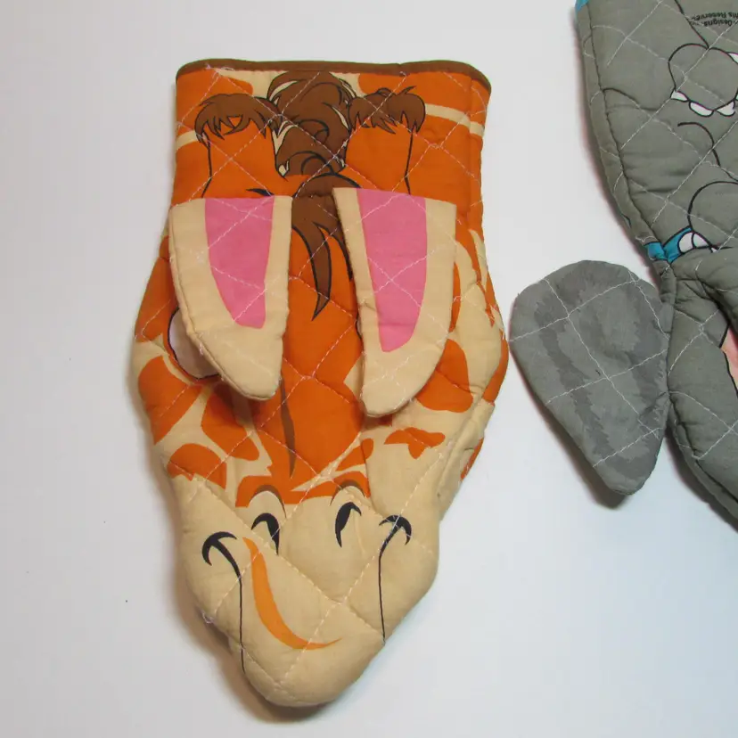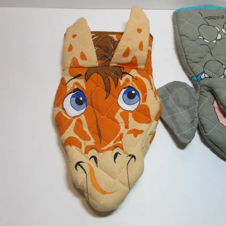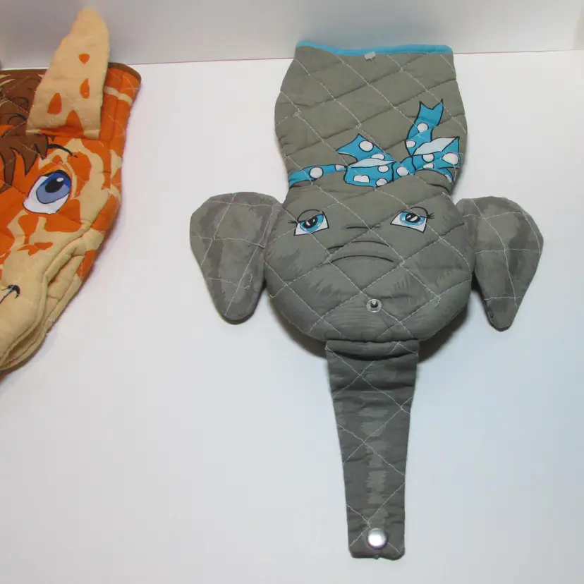 These fun potholders have some wear, the elephant has a few loose threads. Still a lovely pet to use and display. The giraffe is about 11 1/2" x 6". This is shipped from a smoke free home. Thanks for looking!