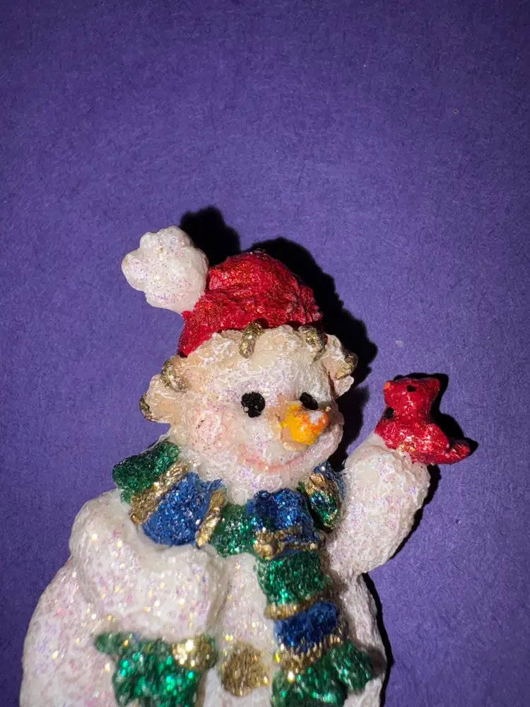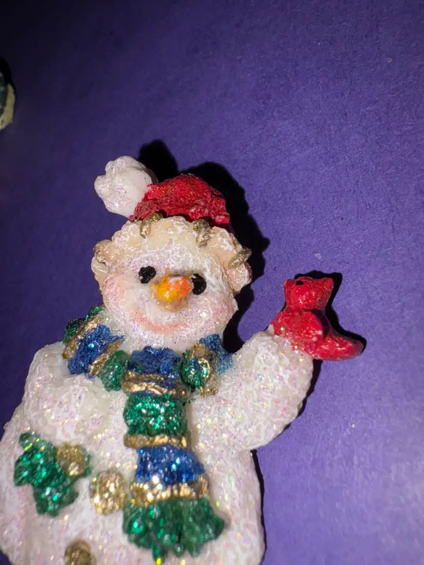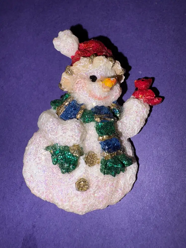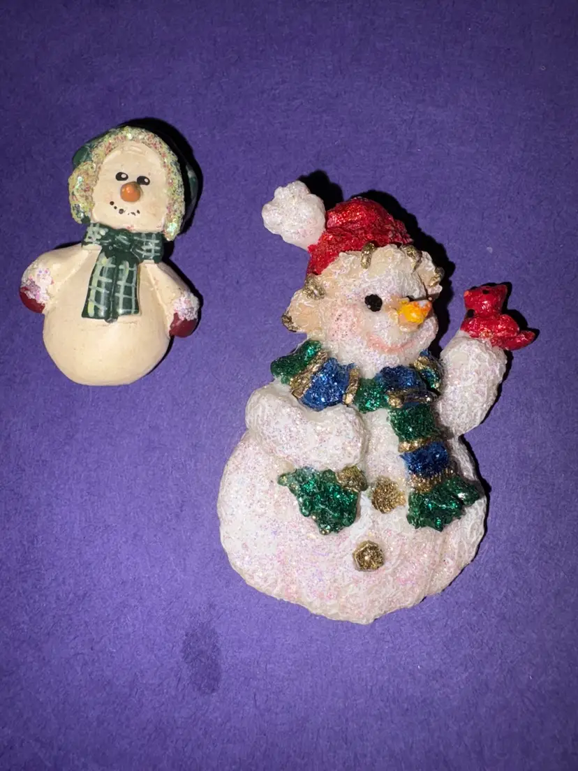 These adorable Christmas snowman brooches / pins are in good vintage condition. One has a bit of glitter and one is holding a cardinal..