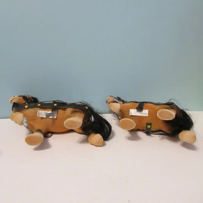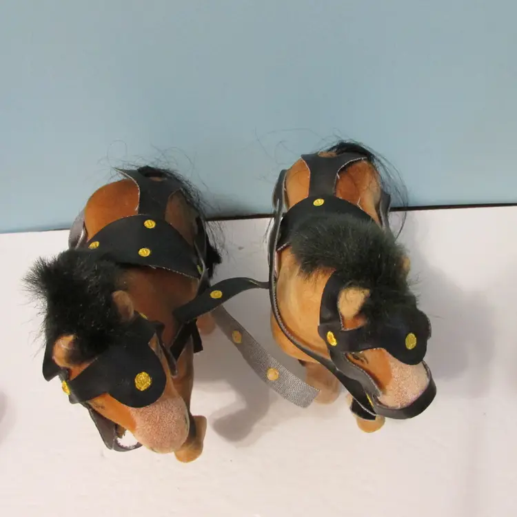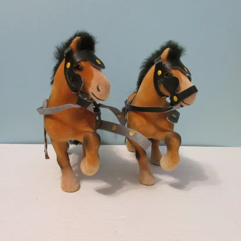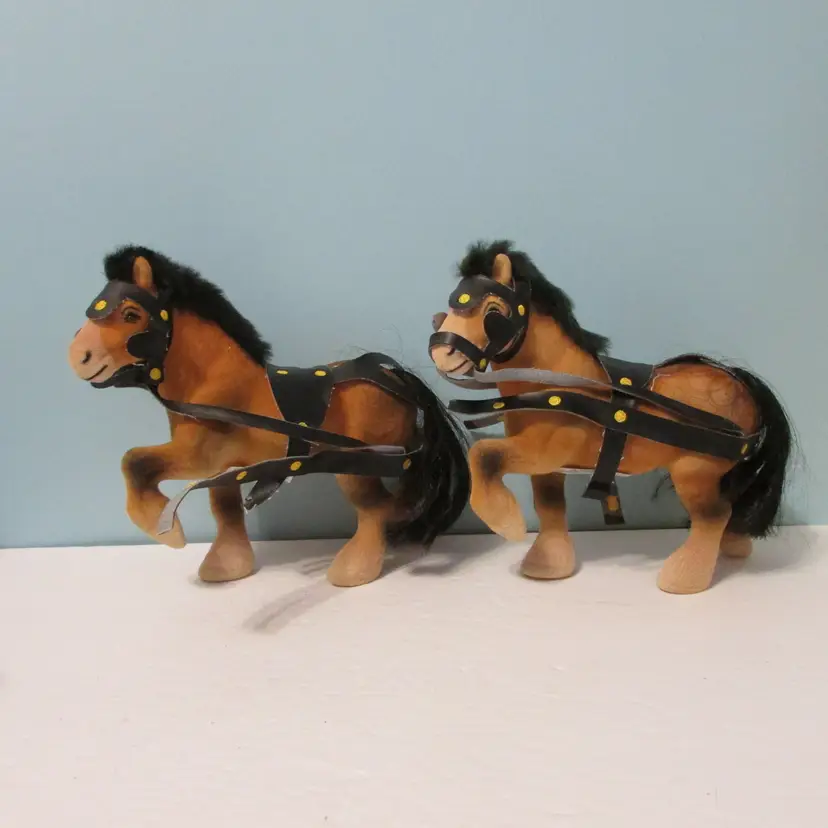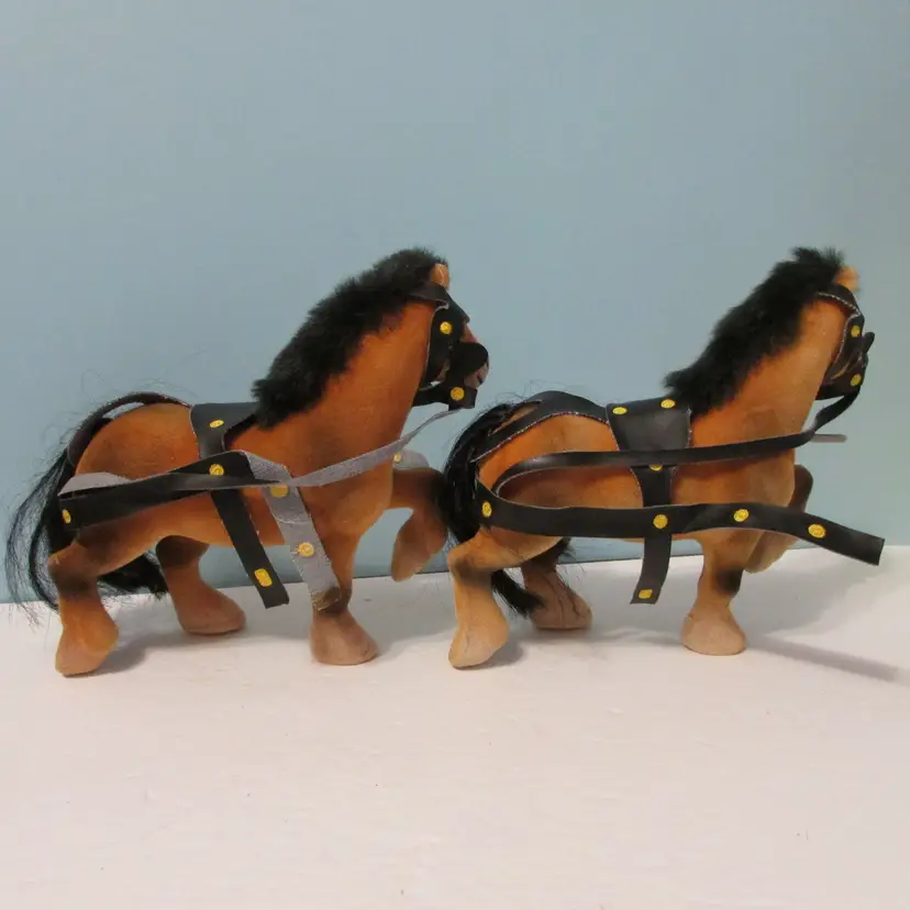 The harness around the horses has detached, could be glued back on. Would be a nice set to add to a Christmas display. Each horse is about 7" x 8" x 3". This is shipped from a smoke free home. Thanks for looking!