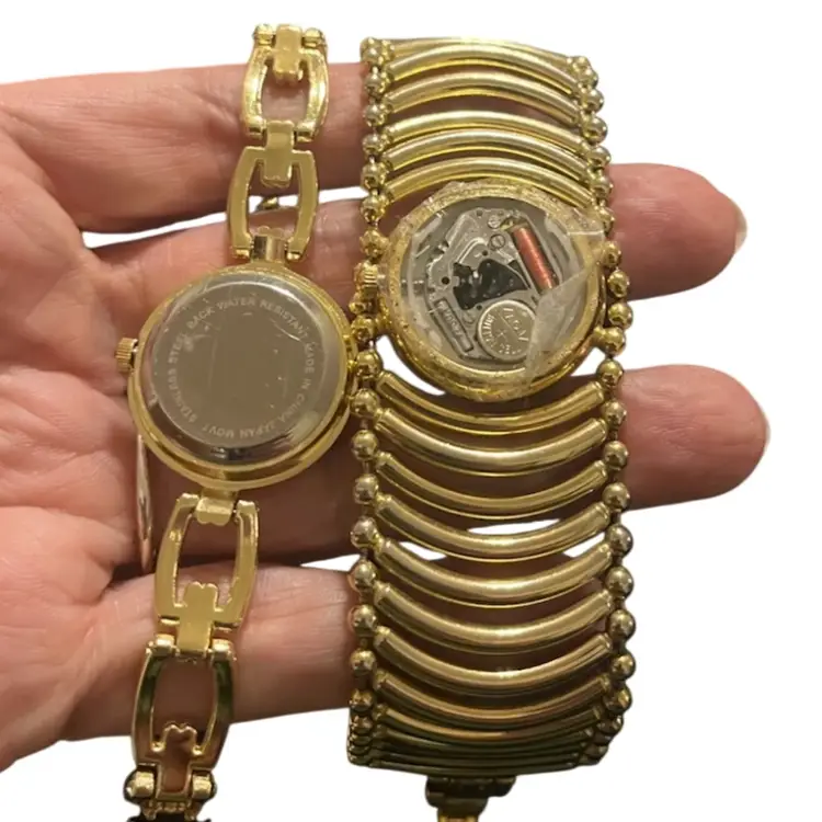 Not working—may just need new battery The second one pictured does not have a back. No metal wear on either