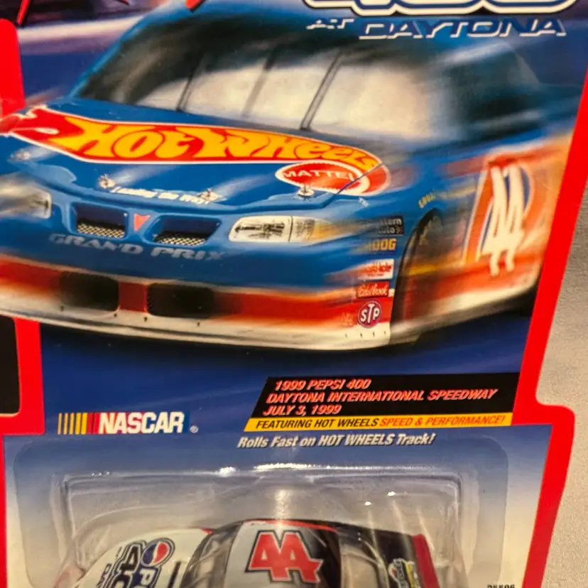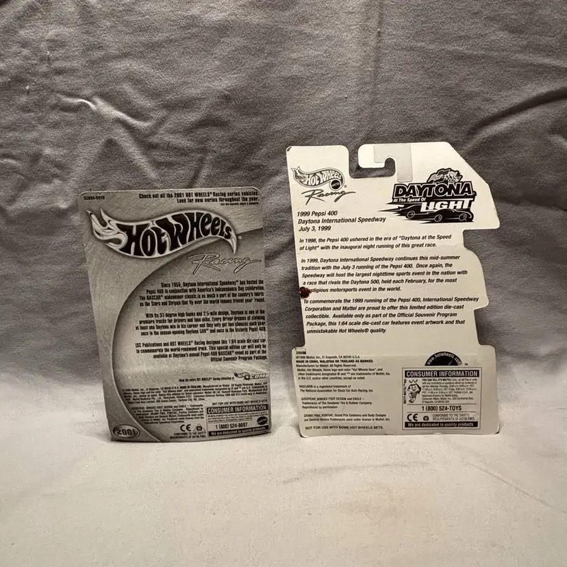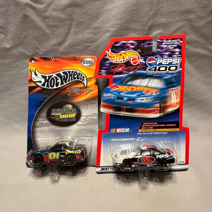 The Lot is a set of two vintage Hot Wheels diecast cars from the Pepsi 400 Daytona race at the speed of light. These 1/64 scale cars feature a Chevrolet GRAND PRIX model in a multi-color design, representing the NASCAR series. Packaged in an unopened box, these collectible cars are a must-have for fans of Hot Wheels Racing and NASCAR. Perfect for collectors or enthusiasts of diecast racing cars, these vintage vehicles offer a unique glimpse into the world of NASCAR racing in 1999.