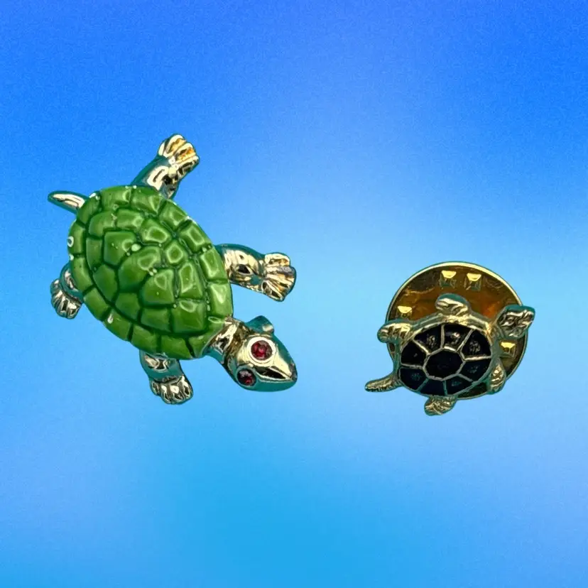 Charming turtle-themed jewelry lot including one Avon brooch and one small lapel pin.
