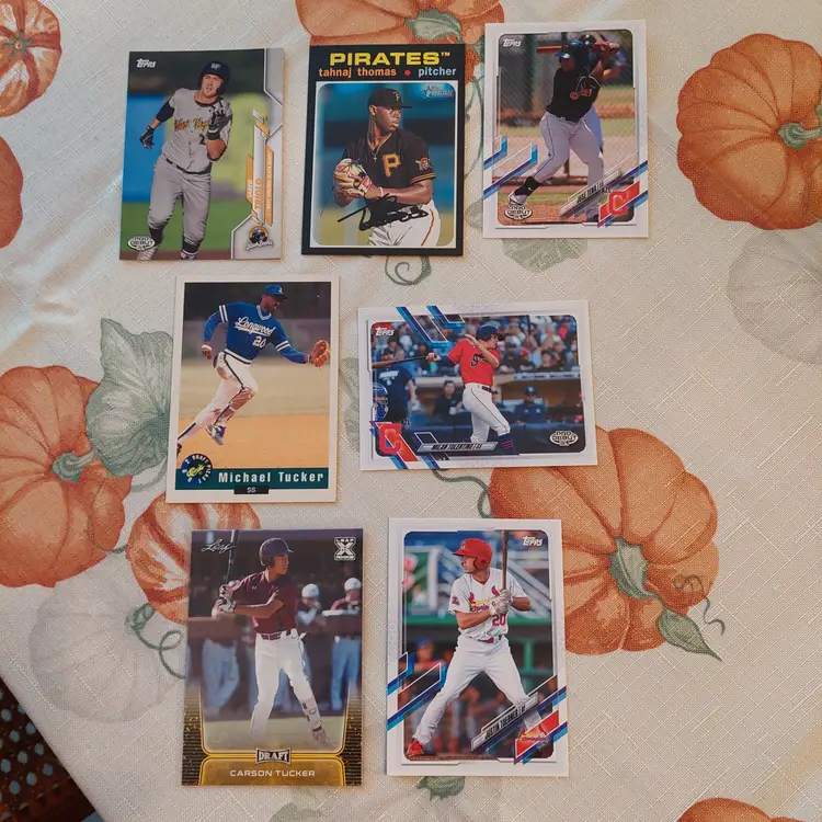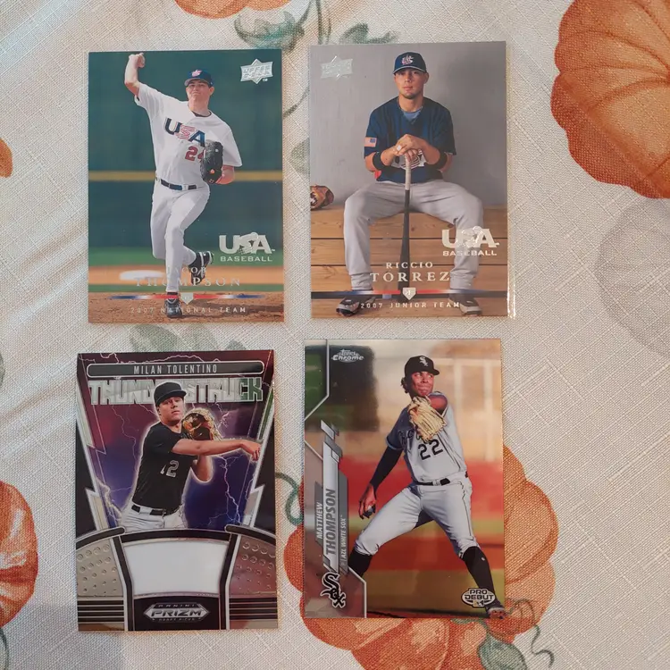 Jacob Thompson 2008 Upper Deck USA Baseball Insert. Riccio Torrez 2008 Upper Deck USA Baseball Insert. Milan Tolentino 2020 Panini Prizm Draft Picks Thunderstruck Insert. Matthew Thompson 2020 Topps Pro Debut Chrome.