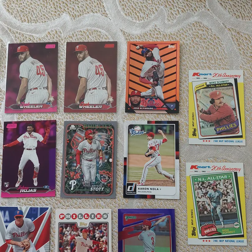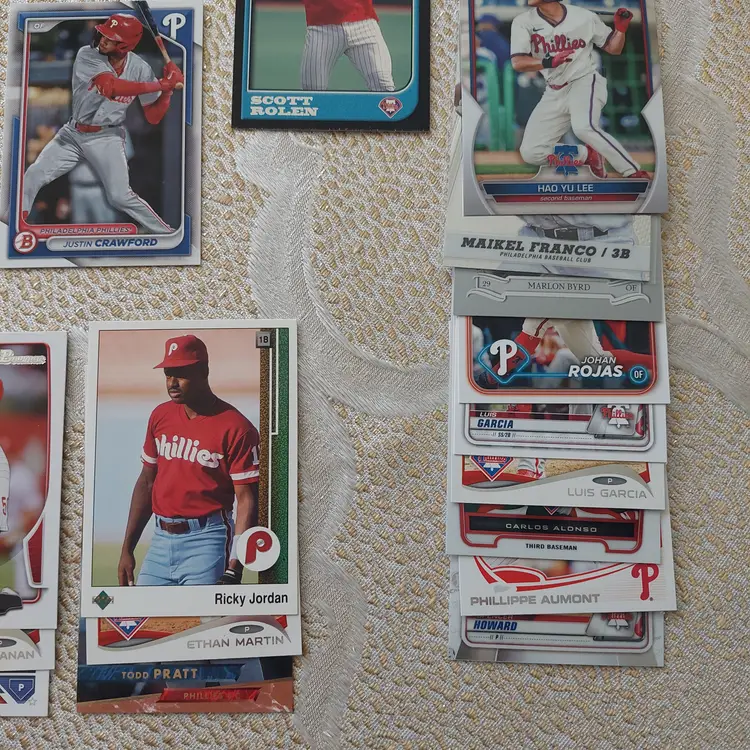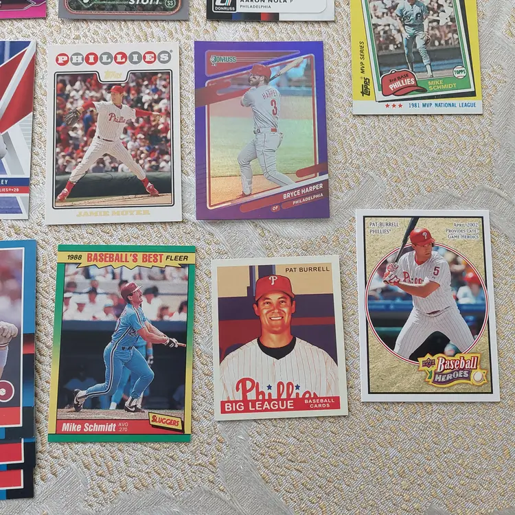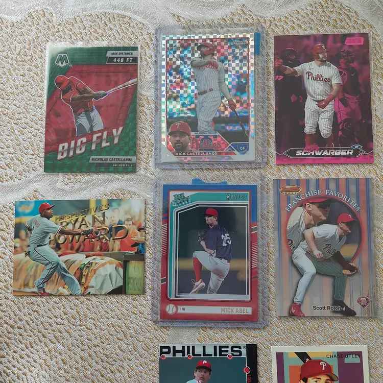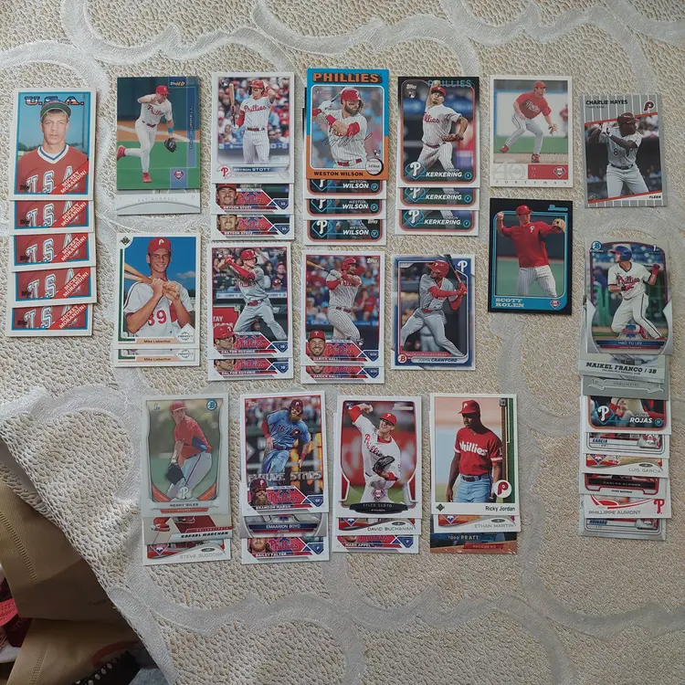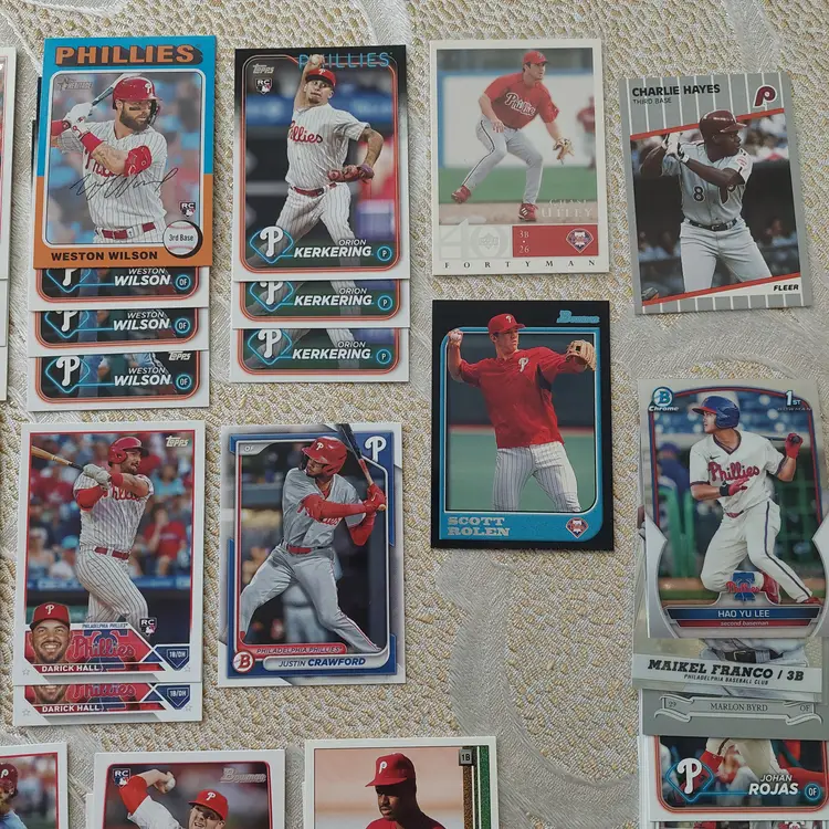 PLAYERS INCLUDED IN THE LOT: Mick Abel, Jose Alvarado, Mike Adams, Philippe Aumont, Carlos Alonso, Mark Appel, Bobby Abreu. Pat Burrell, Dominic Brown, Marlin Byrd, Emaarion Boyd, David Buchanan, Alec Bohm. Nick Castellanos, Steve Carlton, Justin Crawford, Tyler Cloyd. Maikel Franco, Bailey Falter. Luis Garcia, Ken Giles, Dalton Guthrie, Freddy Galvis. Ryan Howard, Bryce Harper, Spencer Howard, Charlie Hayes, Darick Hall, Cole Hamels. Ricky Jordan. Orion Kerkering, John Kruk. Hao Yu Lee, Mike Lieberthal. Jamie Moyer, Rafael Marchan, Brandon Marsh, Ethan Martin, Mickey Morandini, Dale Murphy, Andrew McCutchen. Aaron Nola. Todd Pratt. Johan Rojas, Scott Rolen, Jimmy Rollins, J.T. Realmuto. Kyle Schwarber, Mike Schmidt, Bryson Stott, Steve Susdorf, Curt Schilling. Trea Turner, Jim Thome. Chase Utley. Zack Wheeler, Weston Wilson, Billy Wagner.