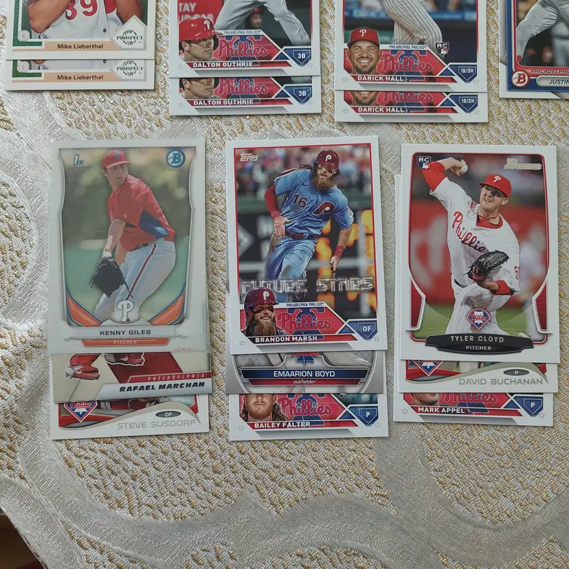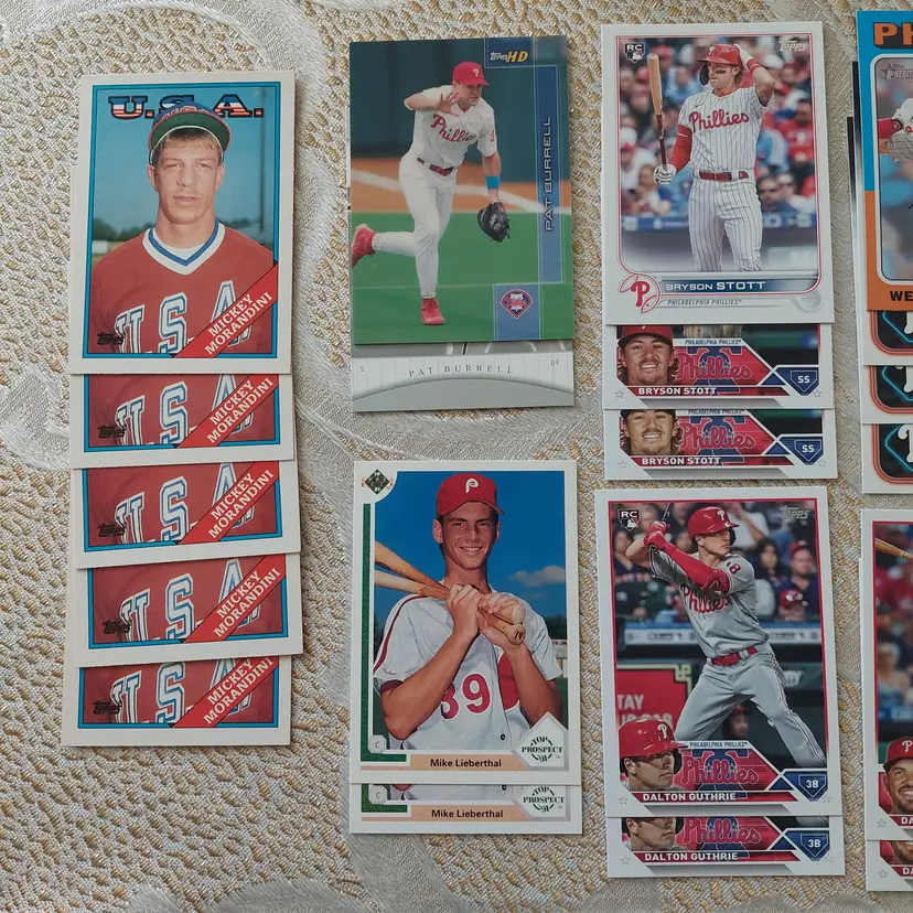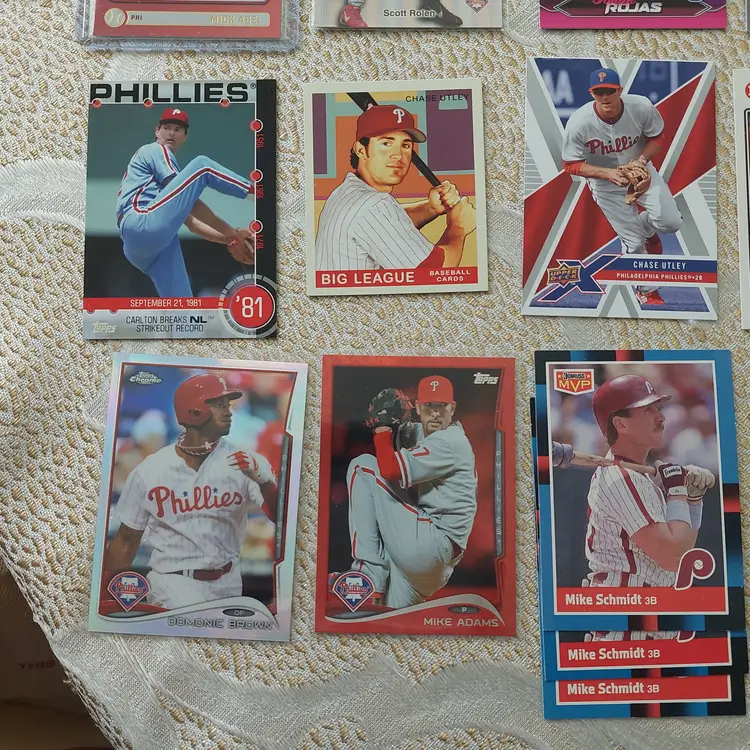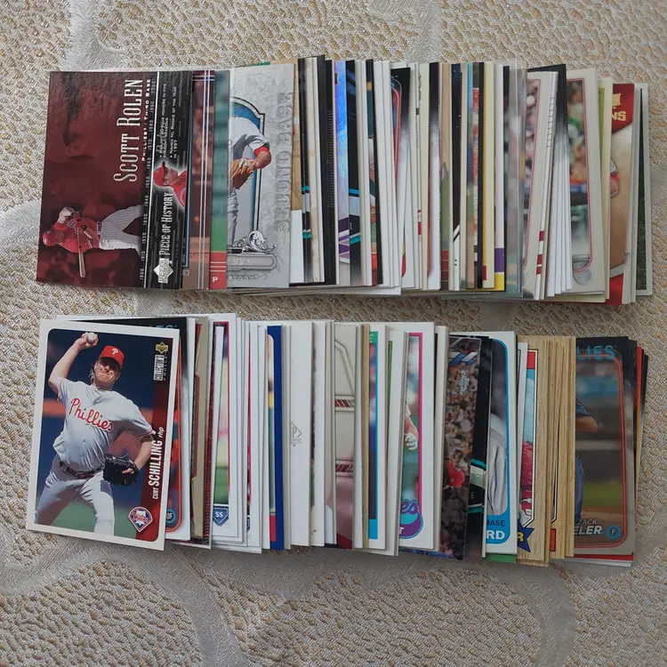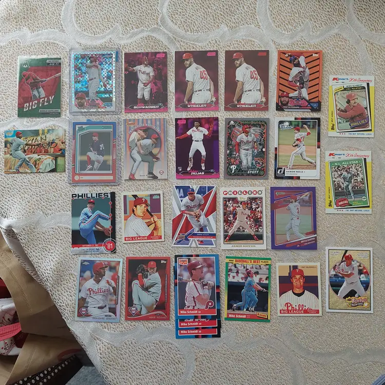 PLAYERS INCLUDED IN THE LOT: Mick Abel, Jose Alvarado, Mike Adams, Philippe Aumont, Carlos Alonso, Mark Appel, Bobby Abreu. Pat Burrell, Dominic Brown, Marlin Byrd, Emaarion Boyd, David Buchanan, Alec Bohm. Nick Castellanos, Steve Carlton, Justin Crawford, Tyler Cloyd. Maikel Franco, Bailey Falter. Luis Garcia, Ken Giles, Dalton Guthrie, Freddy Galvis. Ryan Howard, Bryce Harper, Spencer Howard, Charlie Hayes, Darick Hall, Cole Hamels. Ricky Jordan. Orion Kerkering, John Kruk. Hao Yu Lee, Mike Lieberthal. Jamie Moyer, Rafael Marchan, Brandon Marsh, Ethan Martin, Mickey Morandini, Dale Murphy, Andrew McCutchen. Aaron Nola. Todd Pratt. Johan Rojas, Scott Rolen, Jimmy Rollins, J.T. Realmuto. Kyle Schwarber, Mike Schmidt, Bryson Stott, Steve Susdorf, Curt Schilling. Trea Turner, Jim Thome. Chase Utley. Zack Wheeler, Weston Wilson, Billy Wagner.