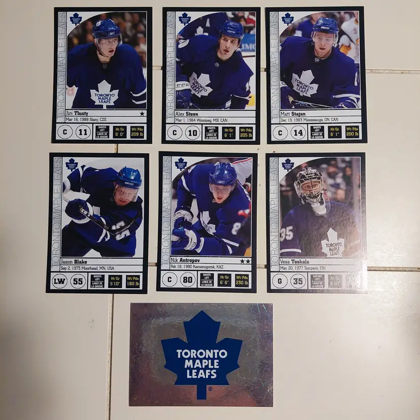Stickers: Nik Antropov. Jason Blake. Vesa Toskala. Jiri Tlusty. Alex Steen. Matt Stajan. Team logo.