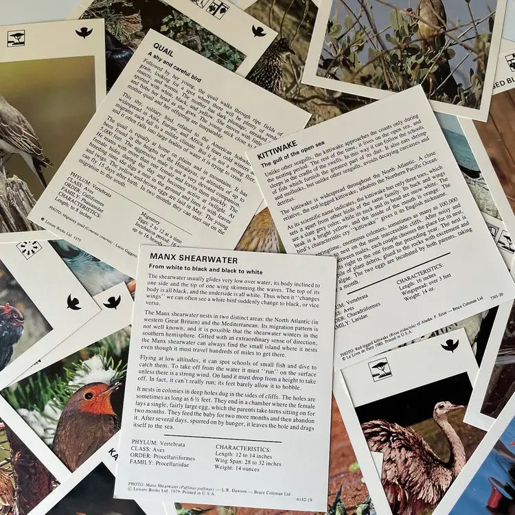 25 Vintage Animal Photo cards with facts and classifications on the back. The cards you see in the photos are the cards you will receive. This lot includes all birds! Cards measure 5” x 4.125”. Great for collecting, education, decor, ephemera, scrapbooking, crafting, junk journaling, collage, or more!