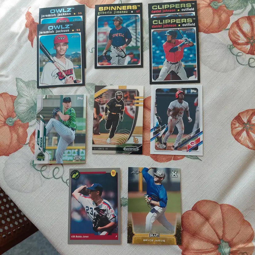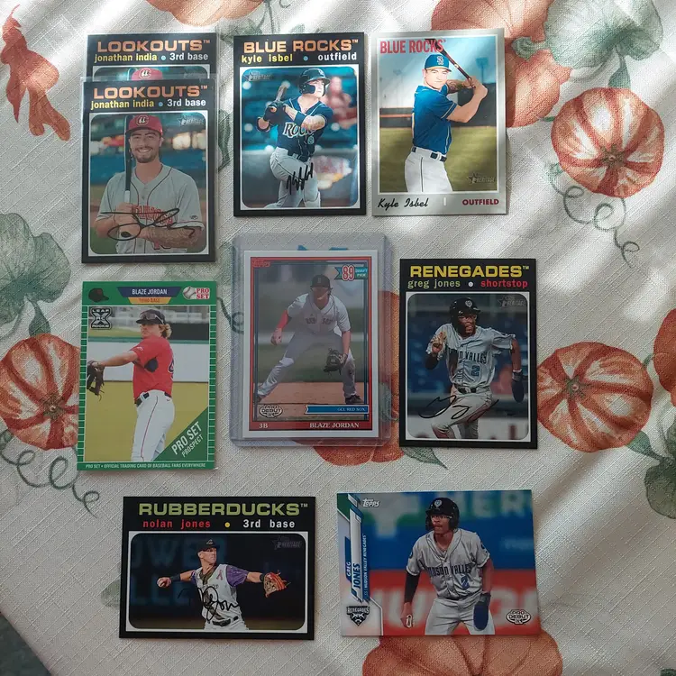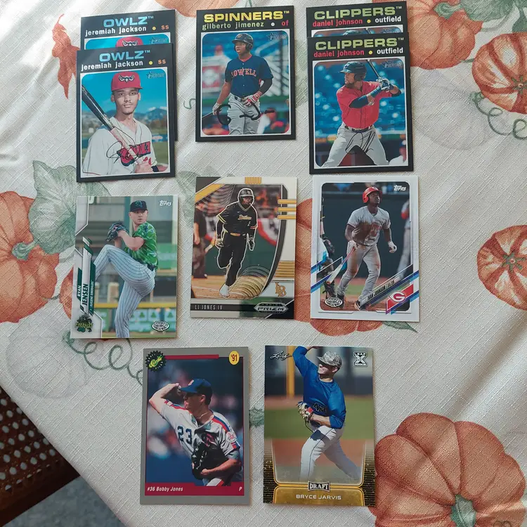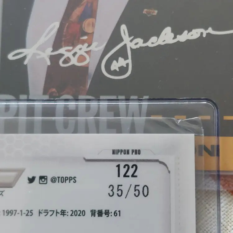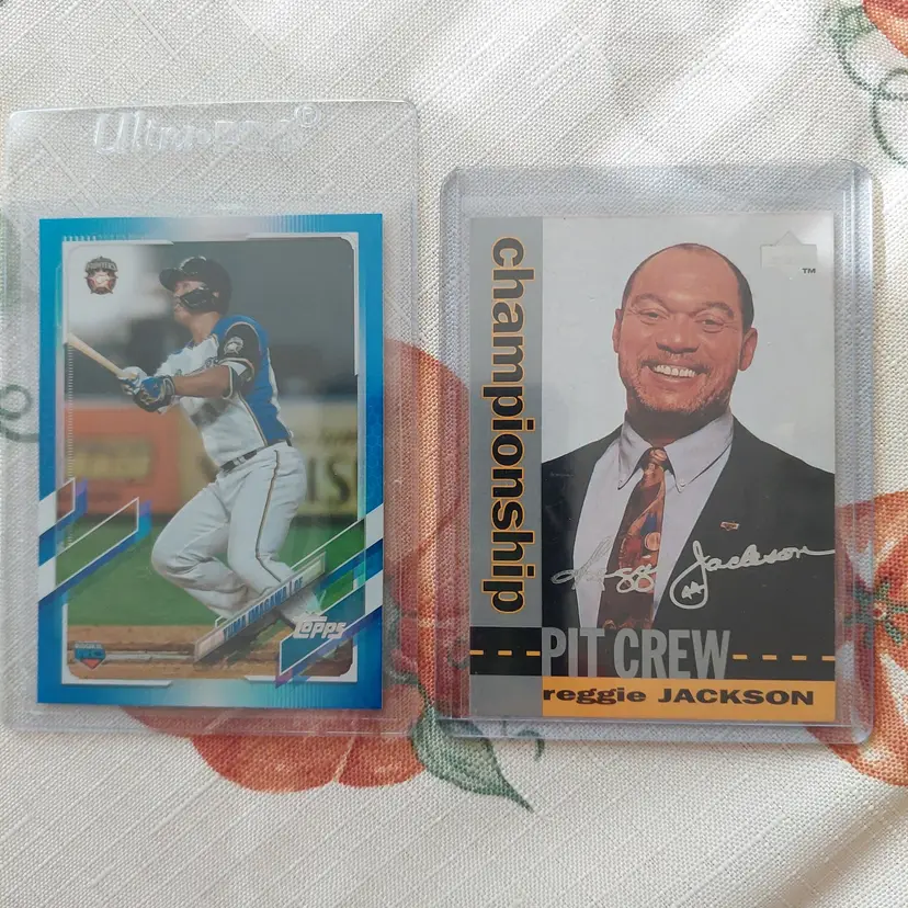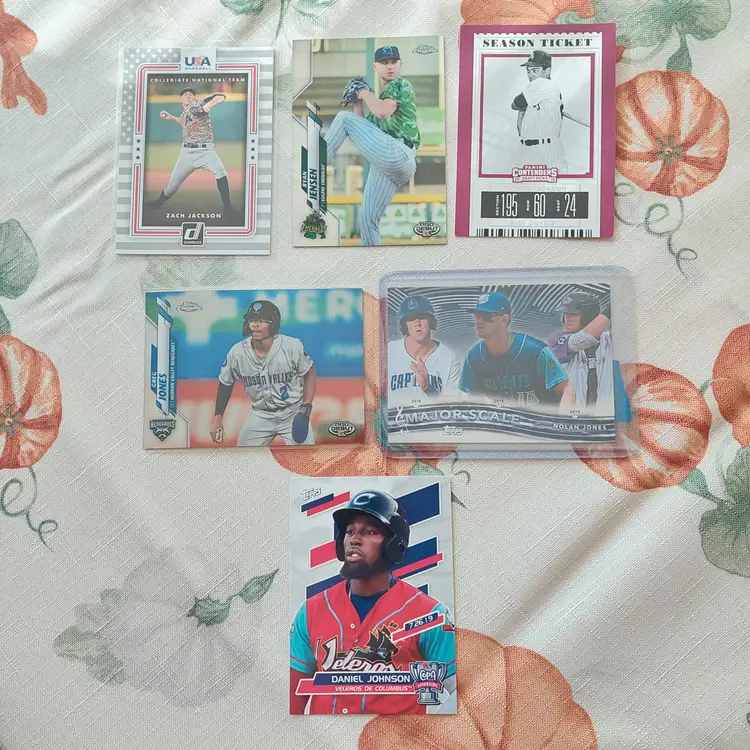 Yuma Imagawa #35/50. 2021 Topps Nippon blue foil Parallel. Reggie Jackson: 1995 Upper Deck silver signature electric silver Insert. 2019 Panini Contenders Draft Picks season ticket. Nolan Jones 2021 Topps Pro Debut major scale Insert. Greg Jones 2020 Topps Pro Debut Chrome. Ryan Jensen 2020 Topps Pro Debut Chrome. Zach Jackson 2016 Donruss USA Baseball Insert. Daniel Johnson 2020 Topps Pro Debut Copa de La Diversion Insert.