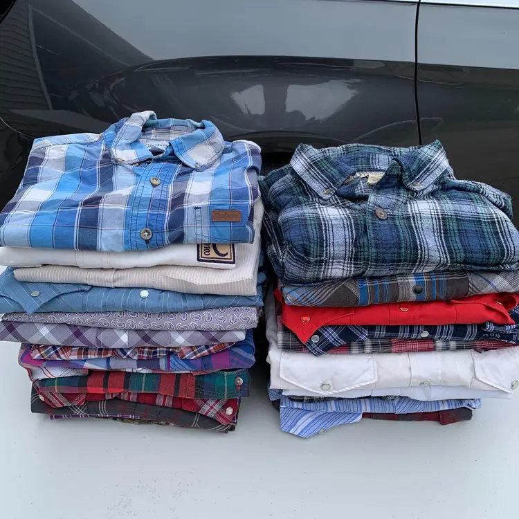 Bulk lot of 28 pearl snap and button up shirts. There are various brands and styles. Sizes are all XL or smaller. Shirts have been visually inspected for major issues, since some of these are older there still may be some minor imperfections. Brands include Wrangler, Carhart, Ely Cattleman, Plains and others. Feel free to reach out with any questions. Shipping from South Central IL. Local Pickup also welcome