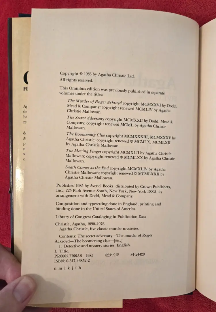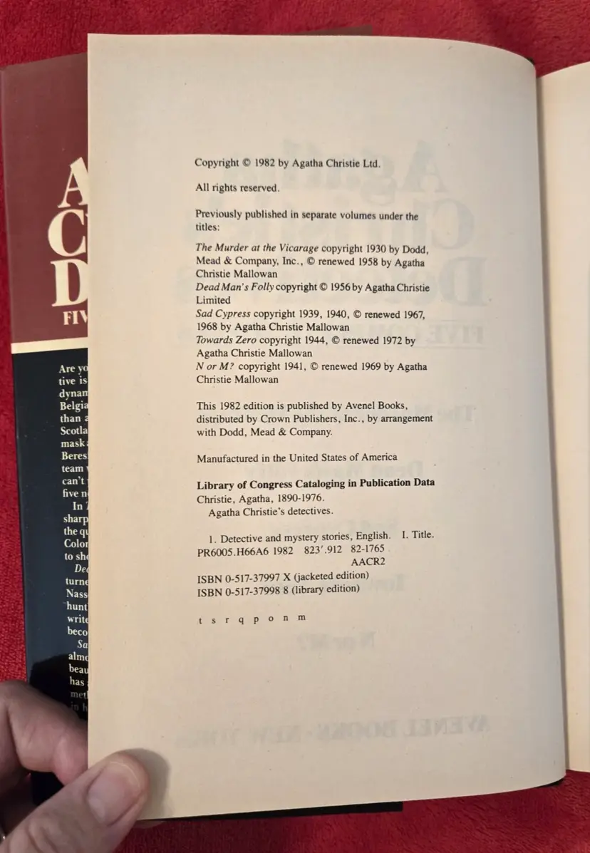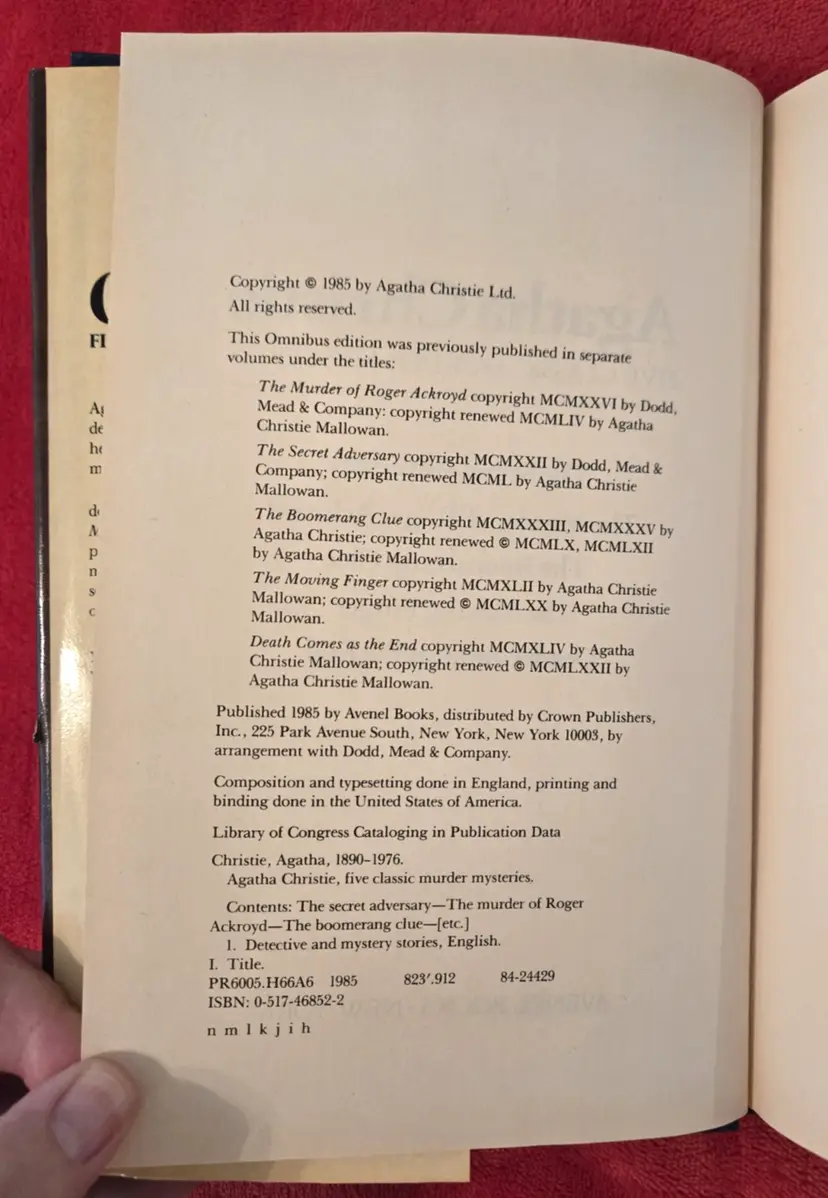 Each Omnibus has 5 stories: The Murder at the Vicarage Dead Man's Folly Sad Cypress Towards Zero N or M? The Murder of Roger Ackroyd The Secret Adversary The Boomerang Clue The Moving Finger Death Comes as the End