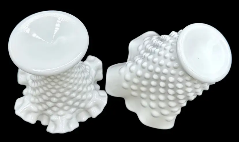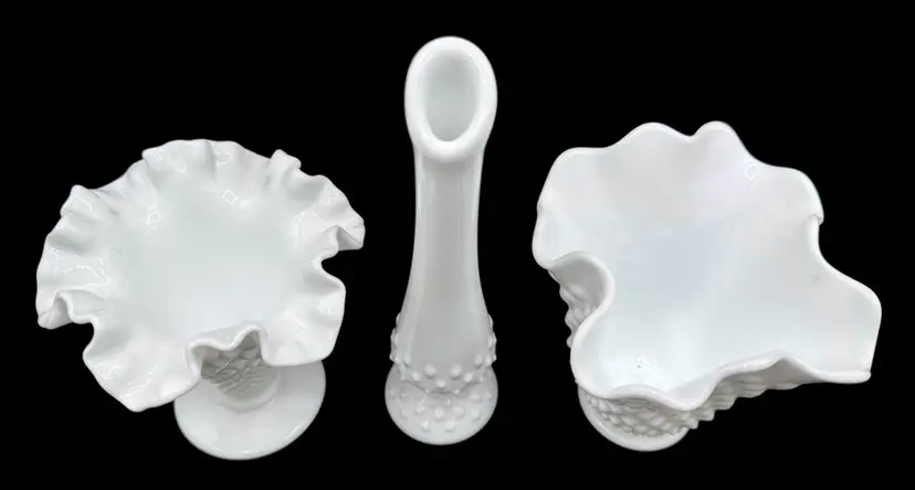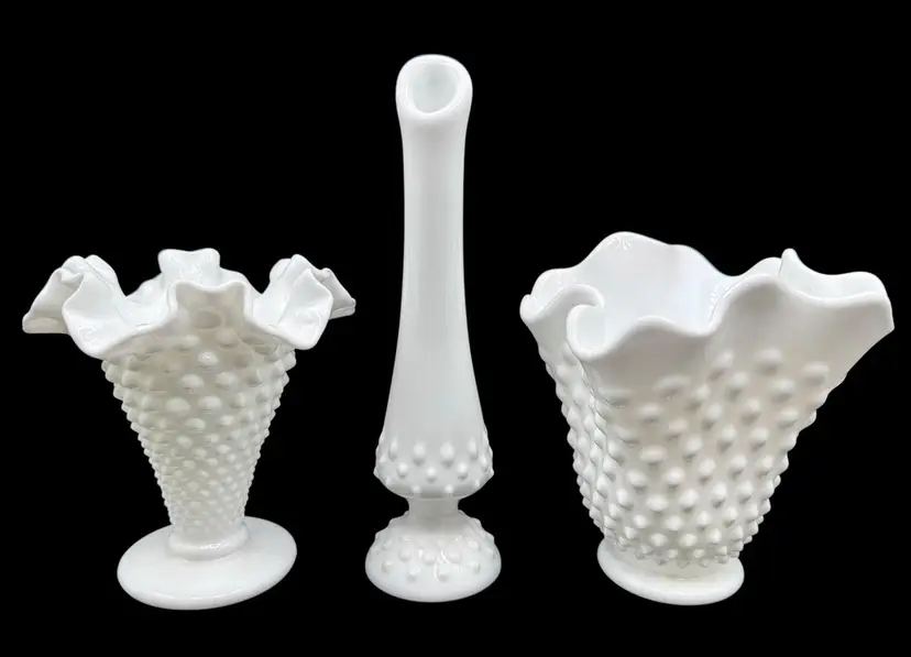 Three hobnail milk glass vases made by Fenton.