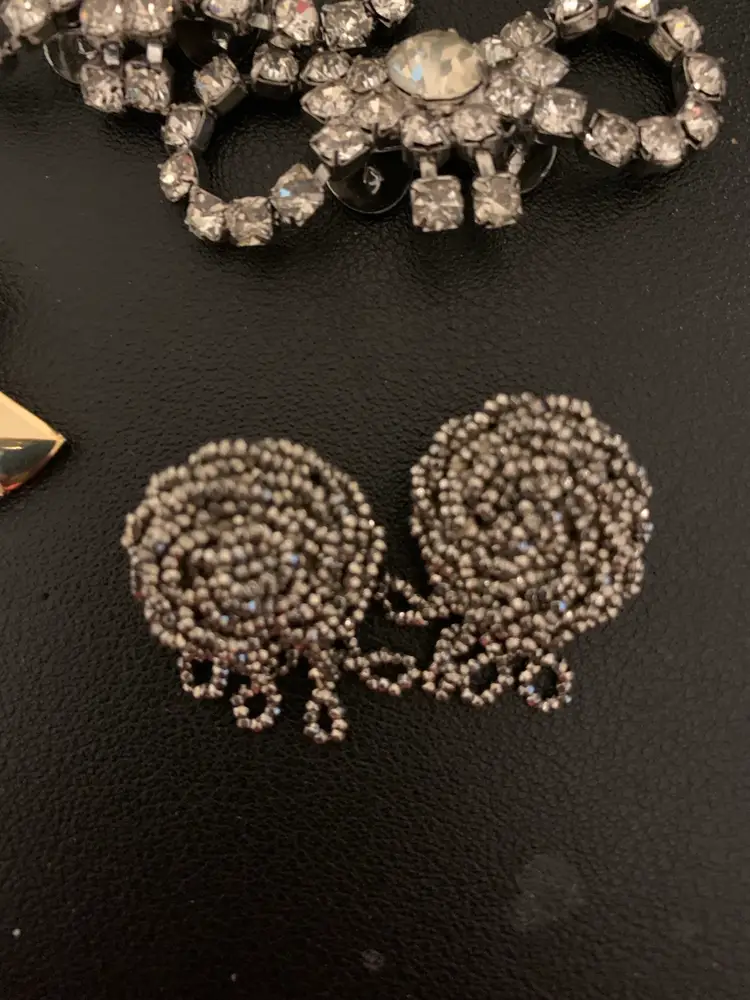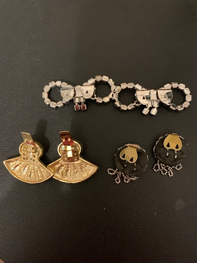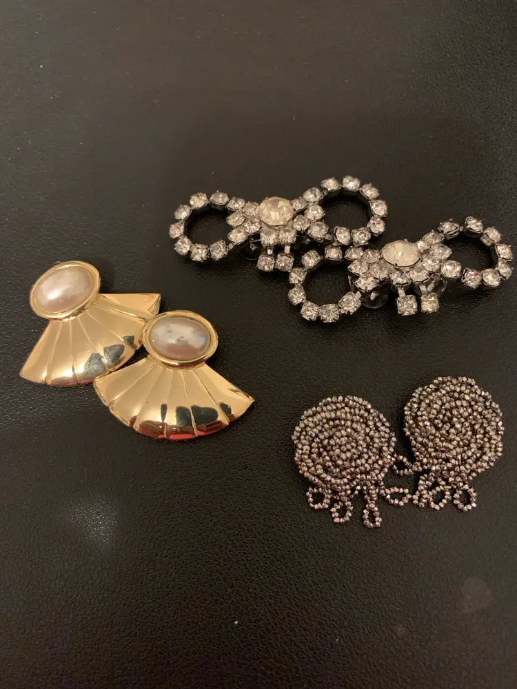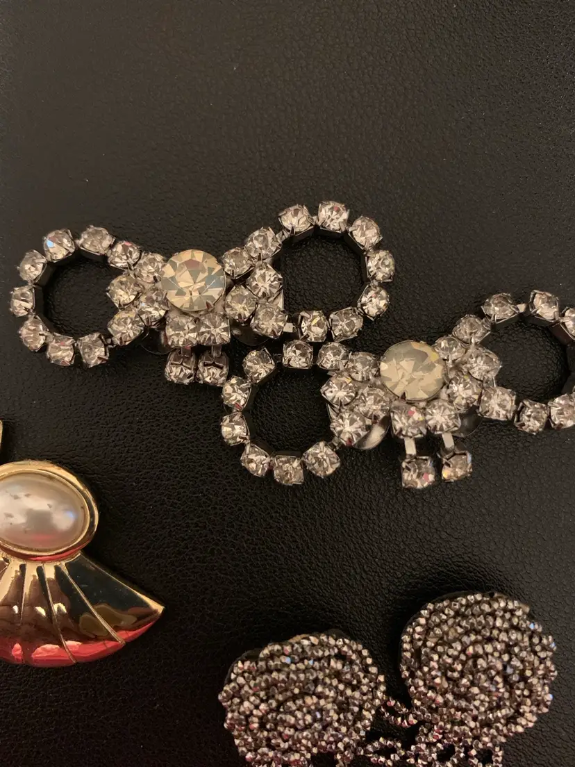 I know very little about shoe clips other than they can really dress up a plain shoe There are three pair in this lot Rhinestone pair are stunning and in very good condition Gold tone with Pearl are designer They are Bluette and made in France Lastly are older round black seed bead clips with felt backing All in very good condition Bows are 2 inches long Pearls are 1 1/2 inches Black seed bead are 3/4 inches