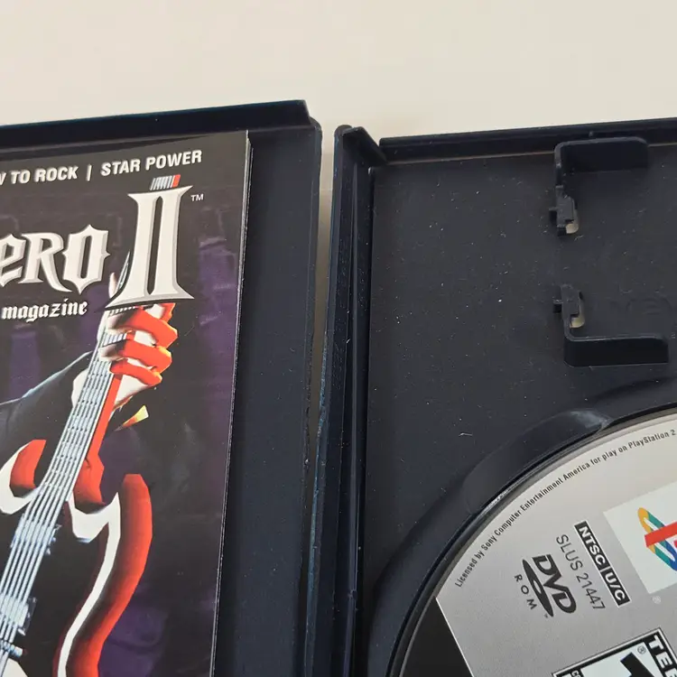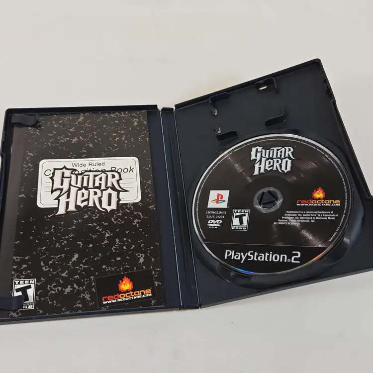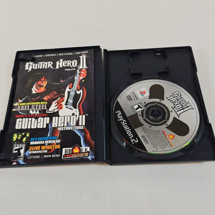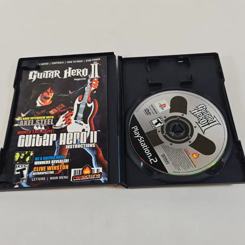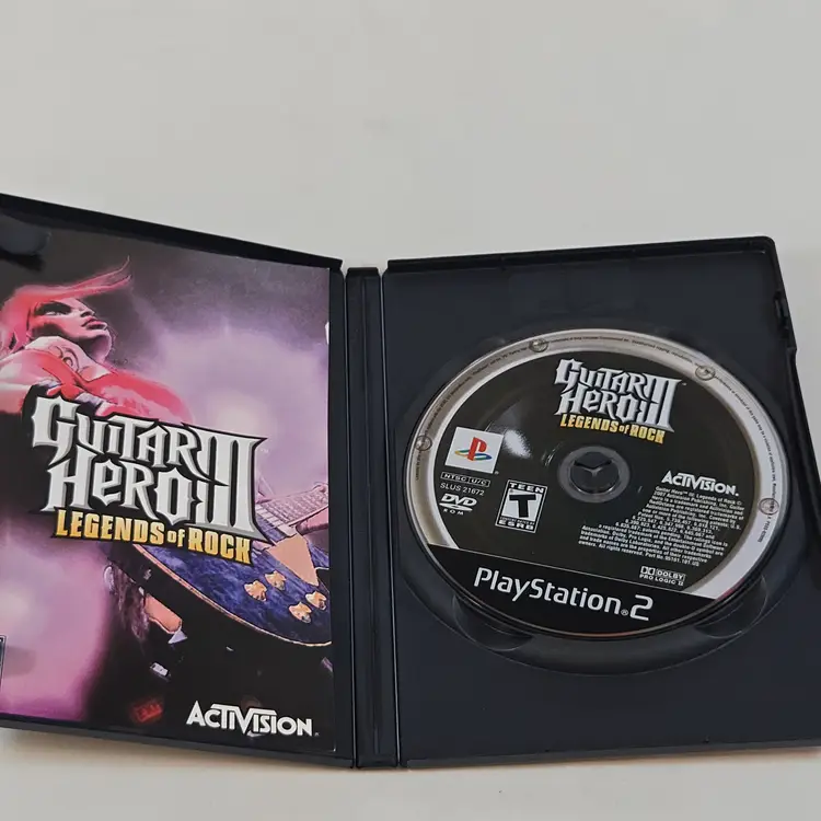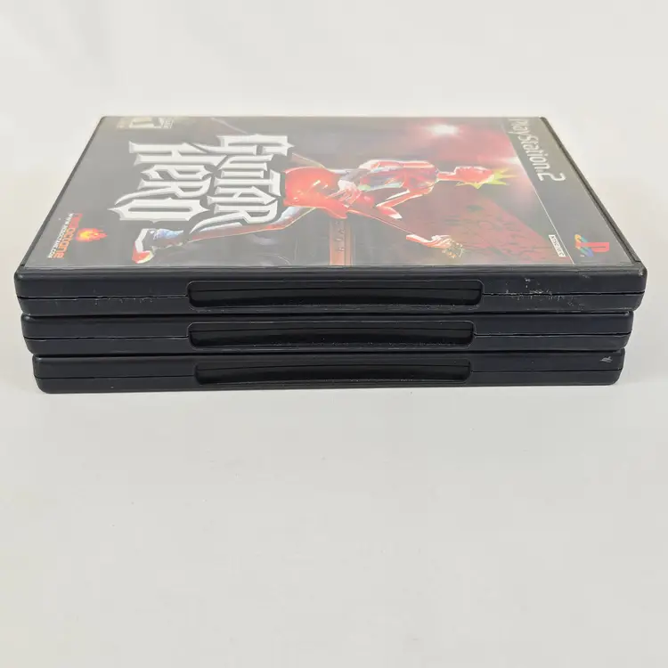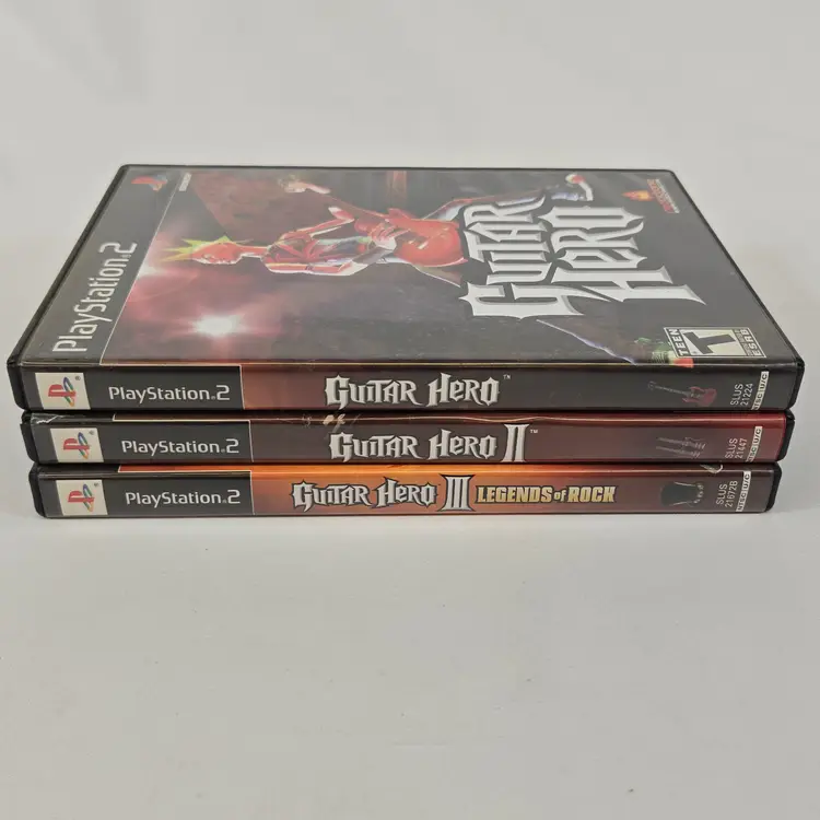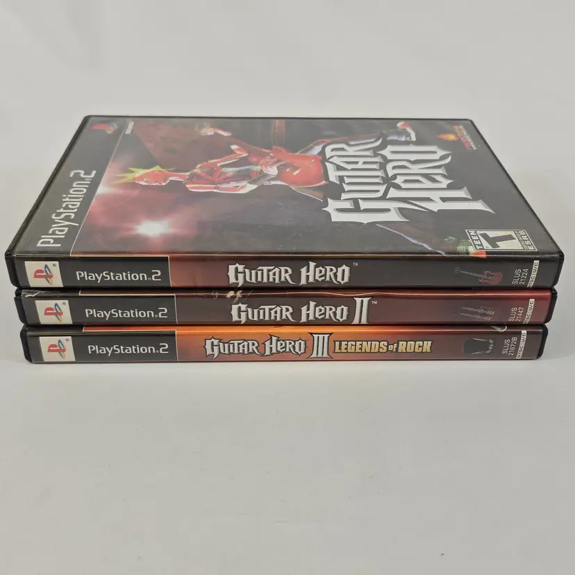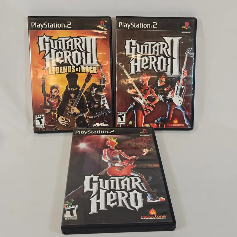 Three PS2 music game classics in original cases: Guitar Hero, Guitar Hero II, and Guitar Hero III: Legends of Rock. Discs show typical light wear from play. Pre-owned and untested—sold as-is for anyone looking to rock out or complete their Guitar Hero collection.
