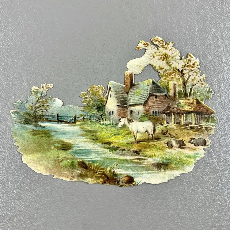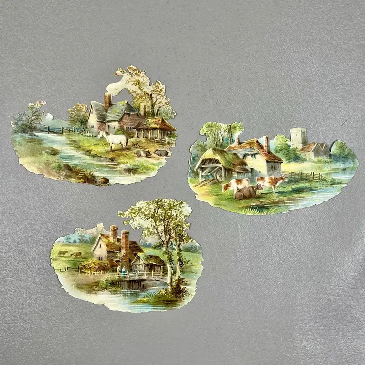 Lot Of 3 Vintage Die Cuts Cottages Farms Cows Horse 5"
