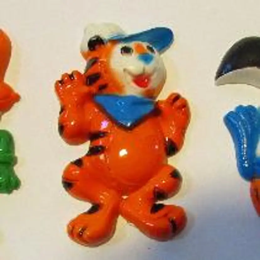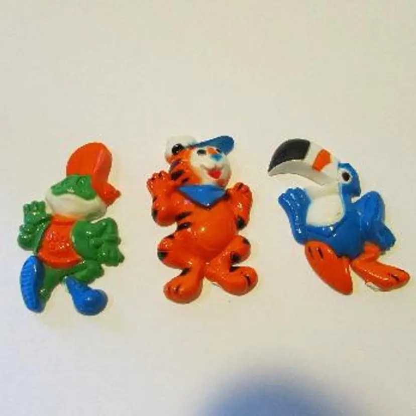 lot of 3 vintage Kellogg's cereal mascot magnets Tony Tiger Frosted Flakes, Honey Smacks Dig'em Frog, Froot Loop Tucan Sam