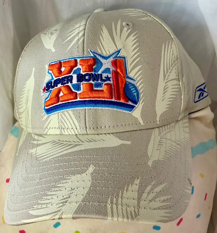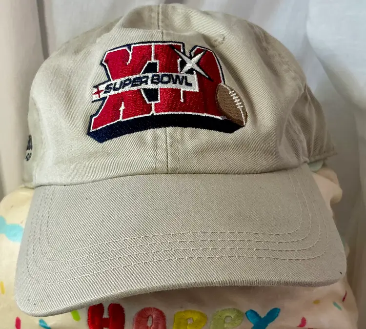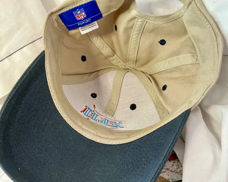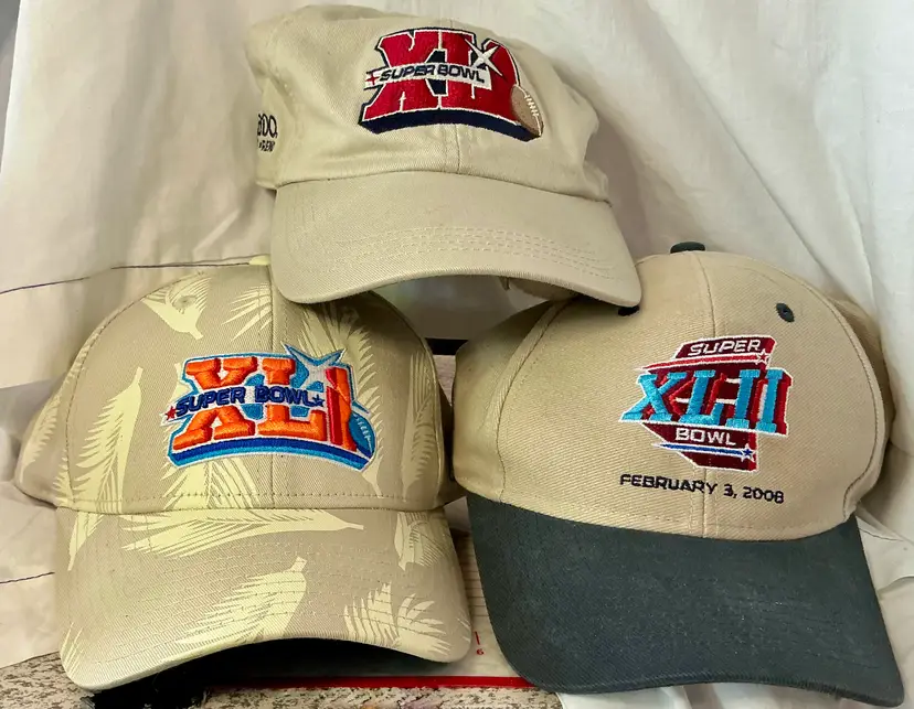 The product is a set of three vintage Super Bowl hats, each featuring the logo of the National Football League (NFL) and representing a different Super Bowl. These hats are designed for fans of football and are perfect for showing support for their favorite team during the championship game. Made in one size to fit most fans, these caps are a great addition to any sports memorabilia collection, especially for those who are fans of the NFL and Super Bowl history.