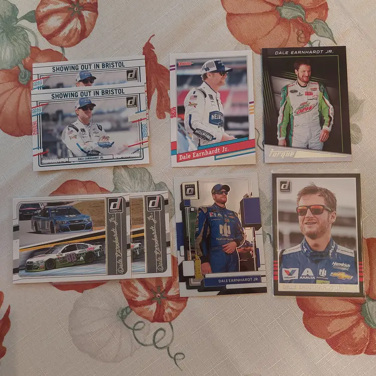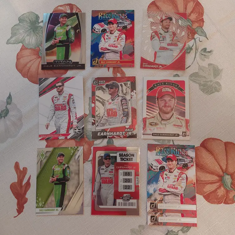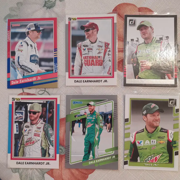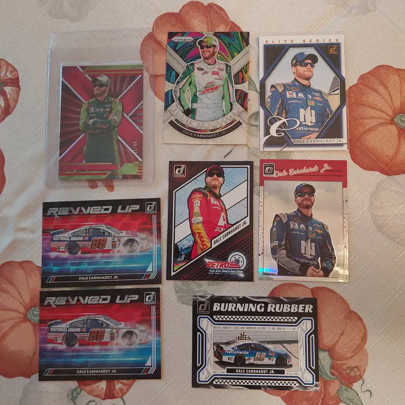 2022 Donruss Elite Series Insert. 2021 Panini Prizm illumination Insert. 2023 Donruss Optic silver Prizm. 2024 Donruss Retro series Insert. 2 of 2023 Donruss Revved Up inserts, checker parallels. 2024 Donruss burning rubber Insert. 2018 Donruss name sp. 2022 Donruss silver Parallel. 2018 Donruss black name sp. 2024 Donruss Red Blue Parallel. 2022 Donruss Retro Carolina Blue Parallel. 2022 Donruss Retro silver Parallel. 2024 Donruss Race Kings red blue parallel.