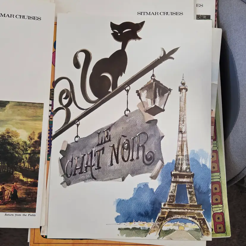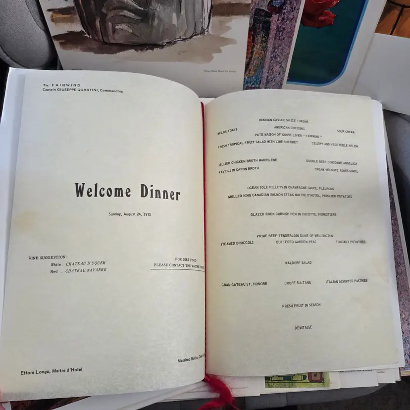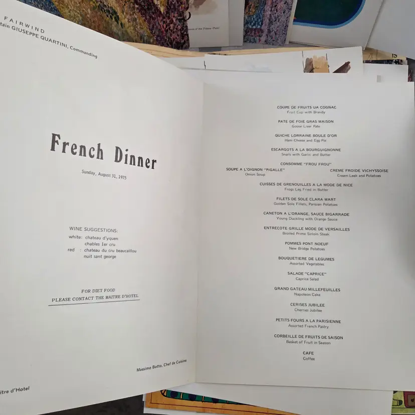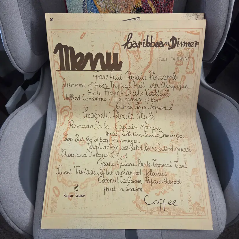 Lot of 33 vintage Sitmar Cruises luncheon and dinner menus from TSS Fairwind in 1975. Menus feature various artwork and photographs and were printed in Italy. 31 of the menus are standard folded menus. 2 of the menus are larger, single-page menus, which have been stored wrapped around the others. The back sides of these are like posters. The dates on the menus go from August 23, 1975 – September 10, 1975. Very cool pieces in good condition. They do show signs of age and wear, and some have stains on them, but they are overall in nice shape. I can’t include pictures of each individual menu, but if you have questions or want a specific pic, please let me know!