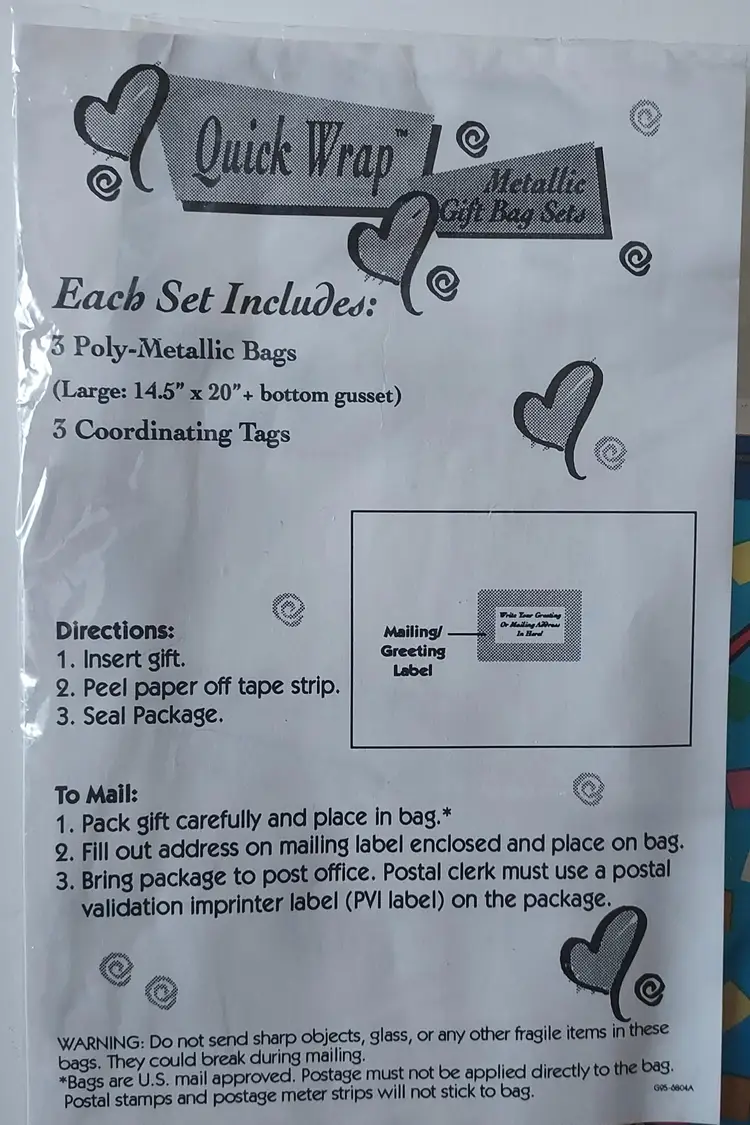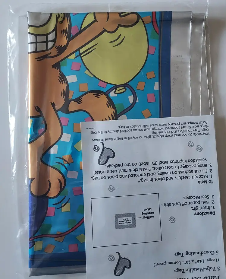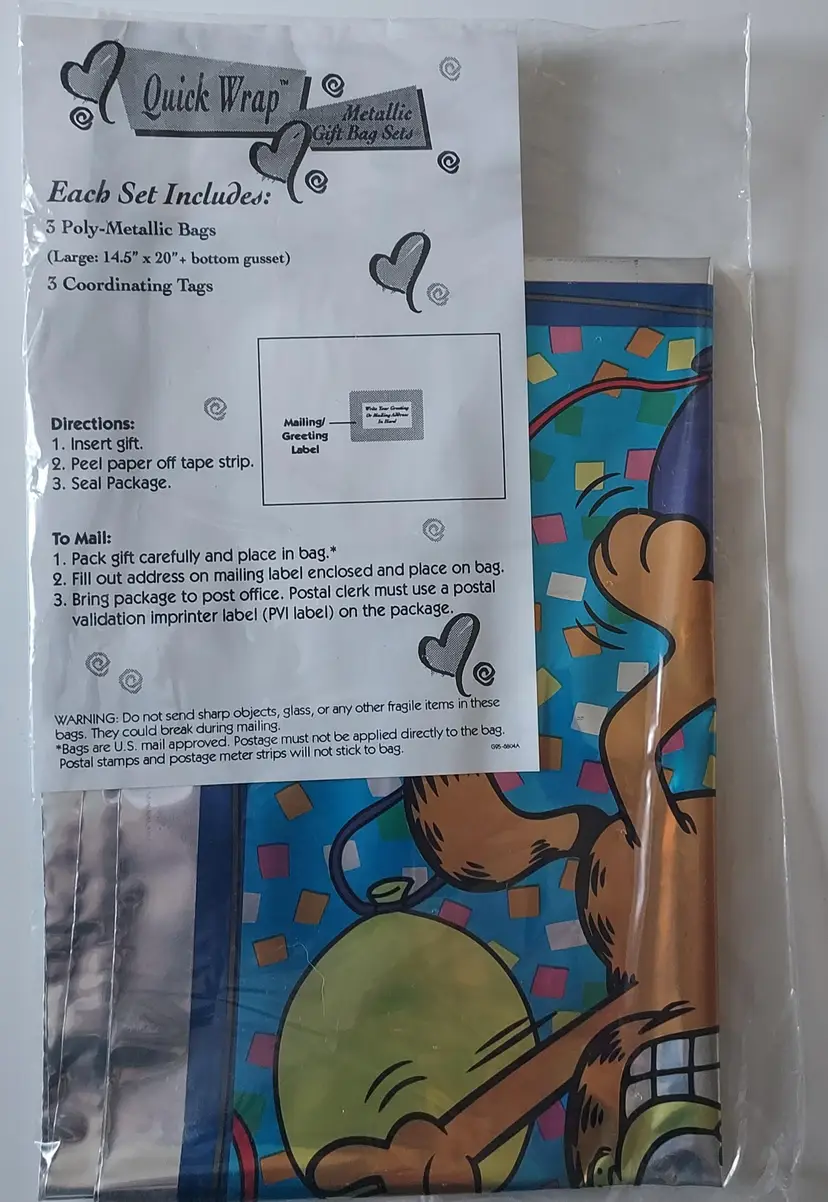 Each package contains 3 poly-metallic bags with 3 coordinating tags. The bags feature Garfield with balloons.
