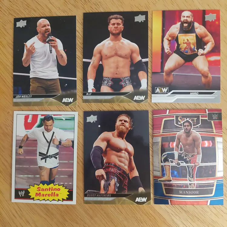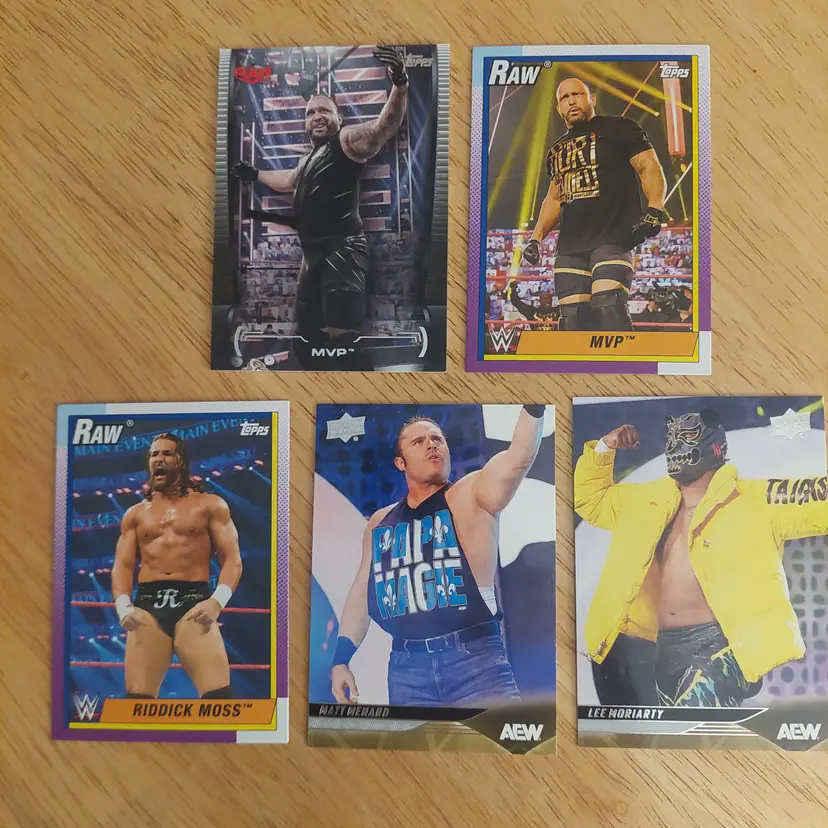 Maryse 2025 Topps Chrome silver Refractor. Ember Moon 2021 Topps Woman's Division roster card. Lee Moriarty 2025 Upper Deck AEW gold Parallel. Dave Mastiff 2022 Panini Select Premier level. The Beast Mortos 2025 Upper Deck AEW first UD.