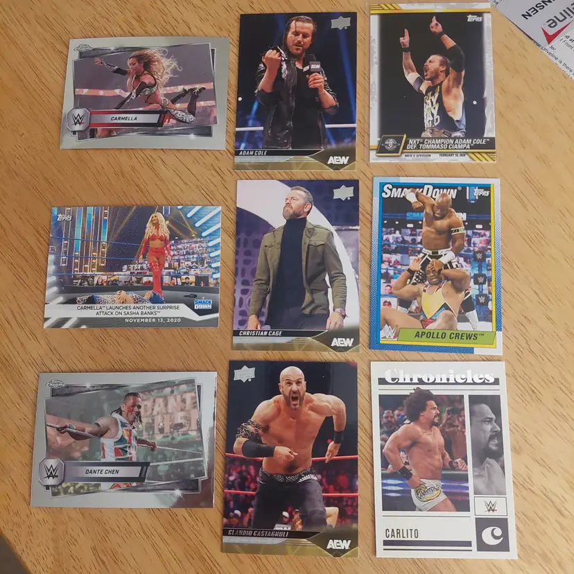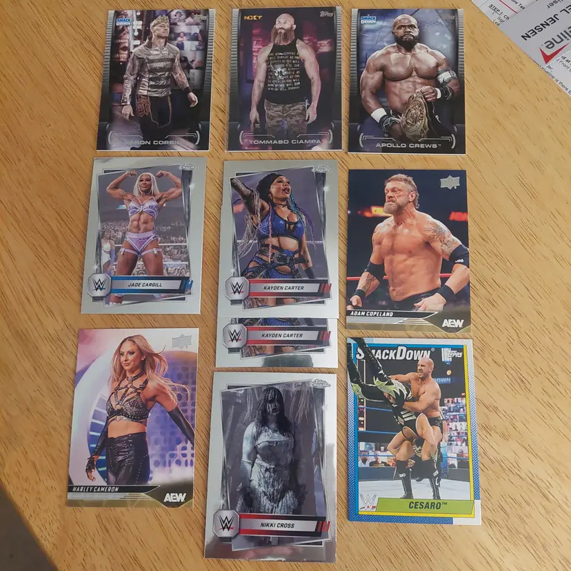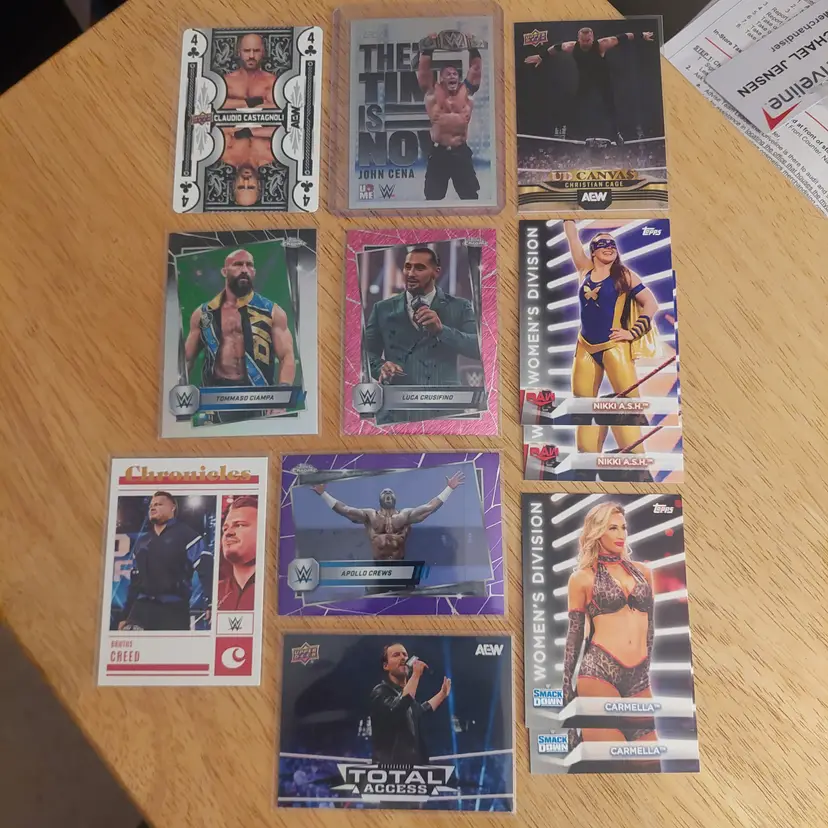 John Cena 2025 Topps Chrome the time is now Insert. Claudio Castagnoli 2025 Upper Deck AEW double or nothing playing card Insert. Christian Cage 2025 Upper Deck AEW UD Canvas Insert. Tommaso Ciampa 2025 Topps Chrome neon green Parallel. Apollo Crews 2025 Topps Chrome Purple Parallel. Adam Cole 2025 Upper Deck AEW total access Insert. Nikki Cross (A.S.H.) 2021 Topps Woman's Division roster card. Carmella 2021 Topps Woman's Division roster card. Luca Crusifino 2025 Topps Chrome pink Parallel. Brutus Creed 2023 Panini Chronicles bronze Parallel.