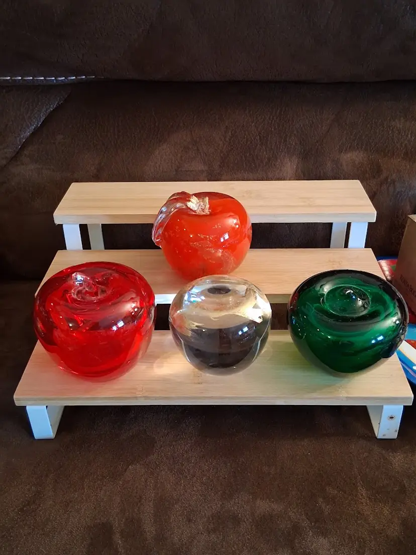 Clear crystal one has no step and has real gold leaf added to it to cover some scuffs as does the red behind on the middle shelf. I added real gold leaf to cover a chipped area and it matches the gold flakes inside the weight! Rest in great cond!