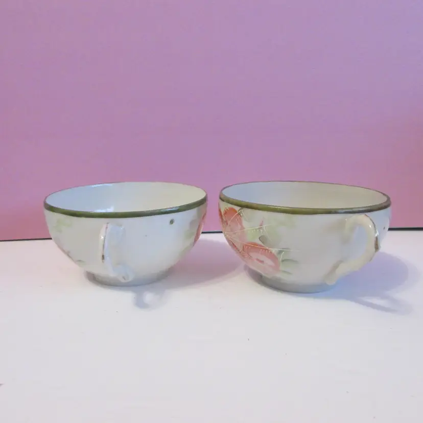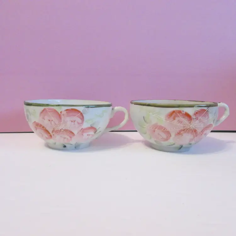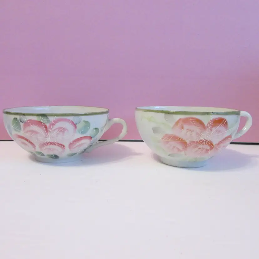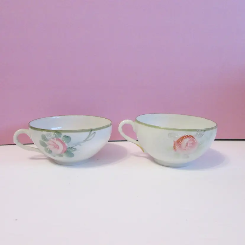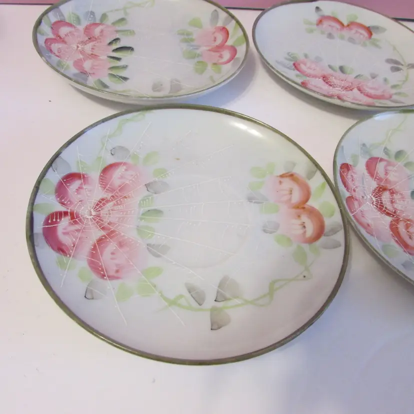 This beautiful set has some wear, but still a lovely set to use and display. There is a raised design over the flowers, it reminds me of cobwebs.