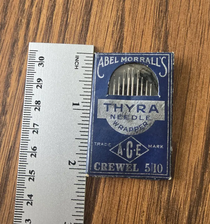 The Abel Morrall's crewel needles, made in England, are in a wrapper marked "Thyra." All ten needles are included.