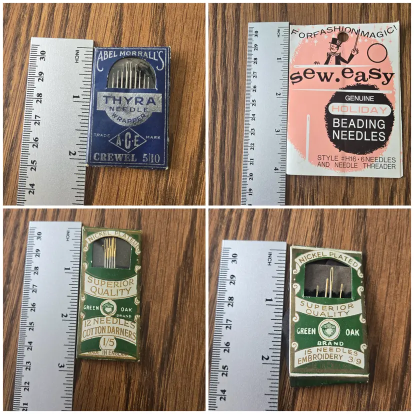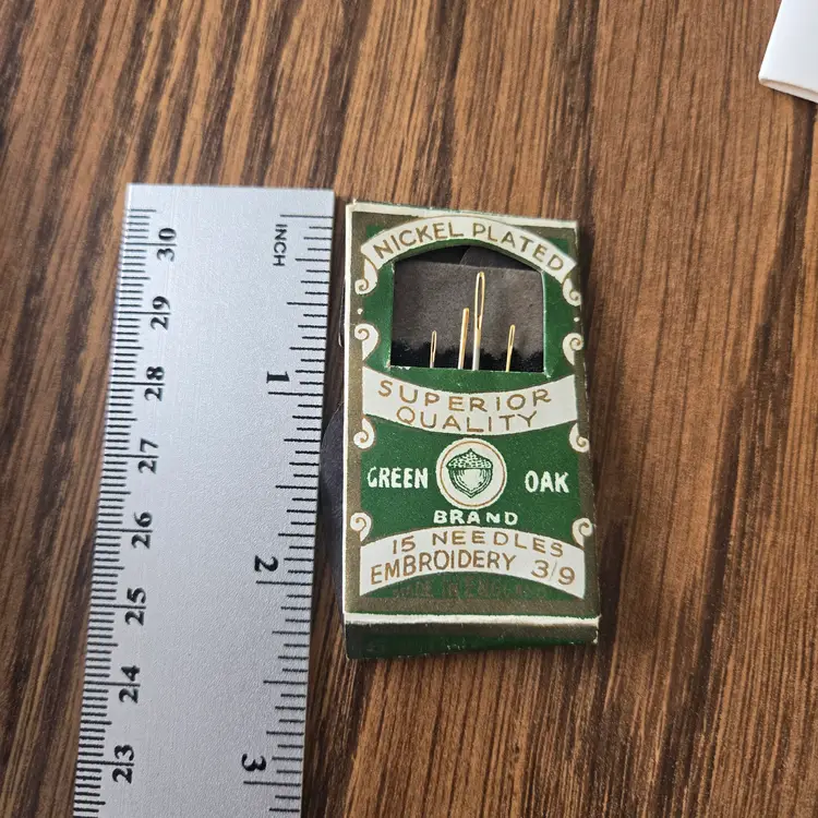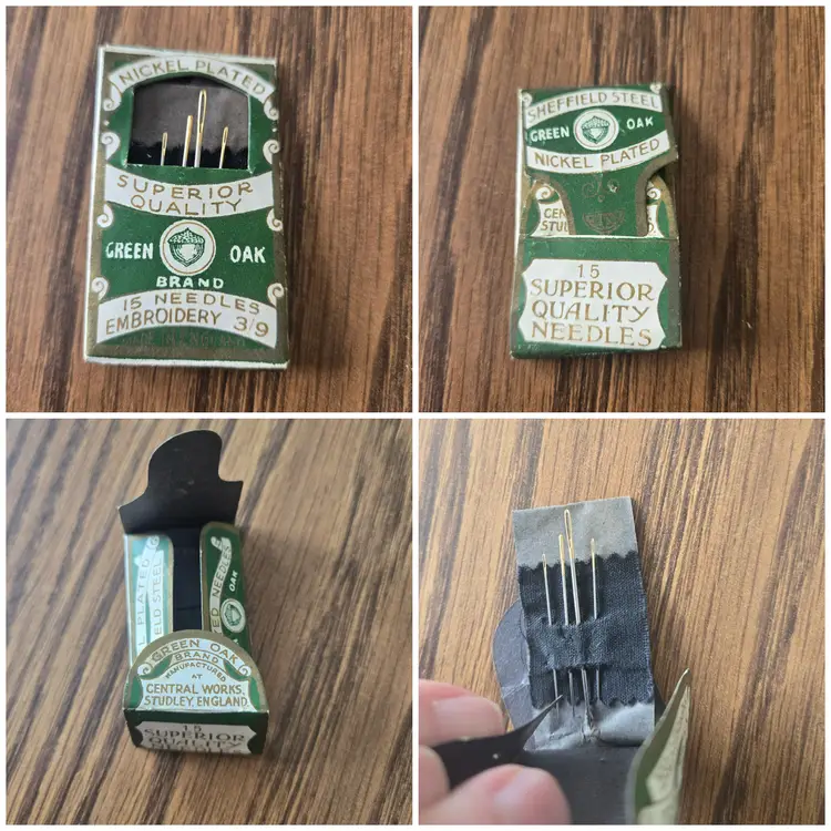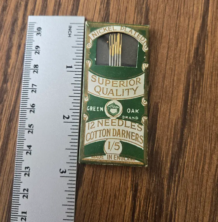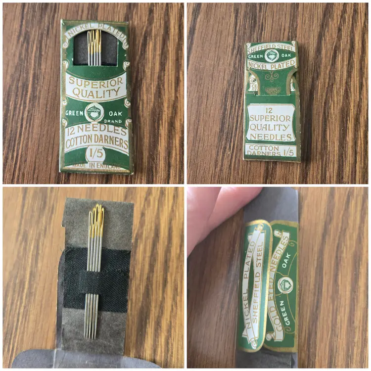 The two packages of Green Oak needles, made in England, are marked "nickel plated Sheffield steel." Both kits are missing needles. One kit has 5 (of the original 12) darner needles. The wrapper for this kit is in very good shape. The other set of embroidery needles has only four needles. The wrapper is also not in great shape all though it is not torn, just wrinkled.