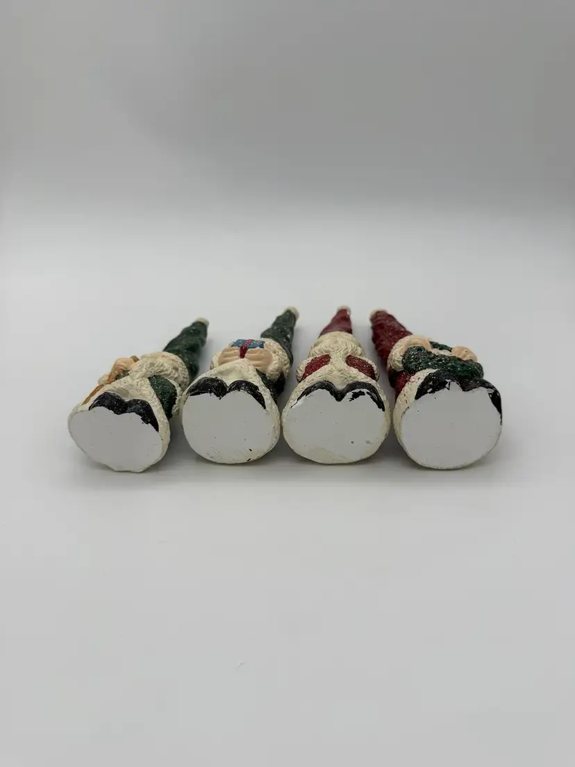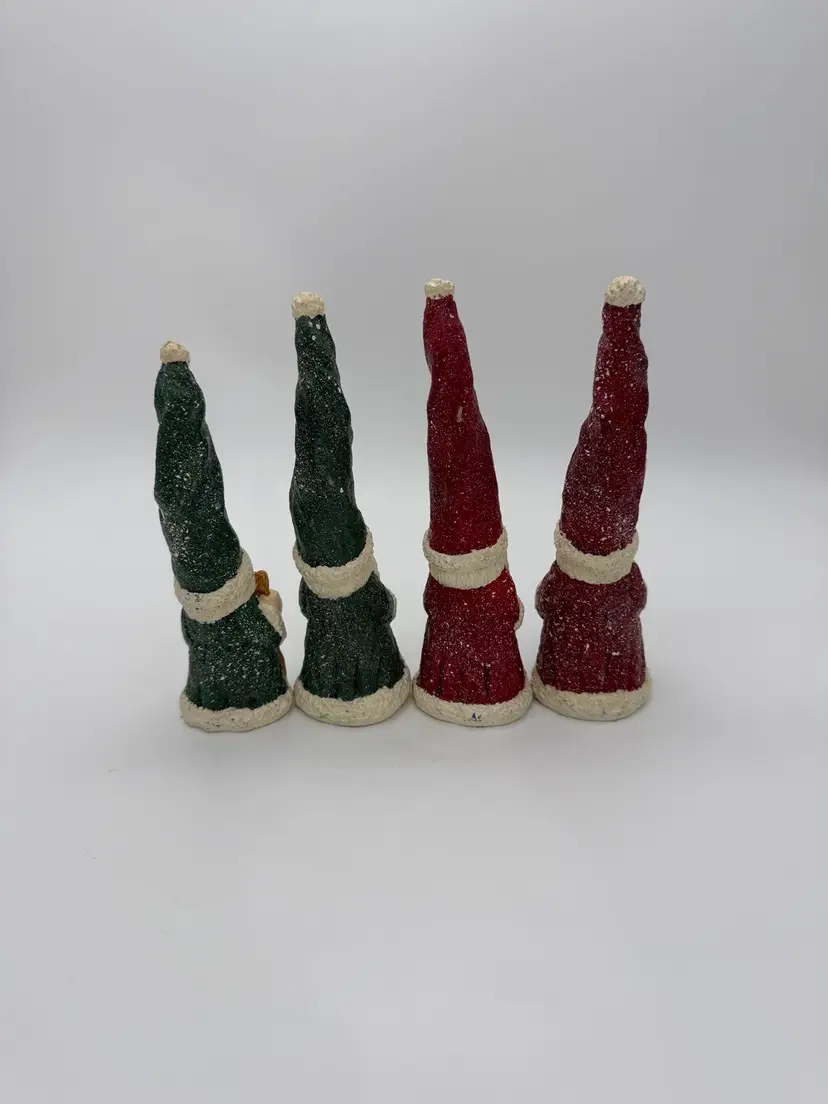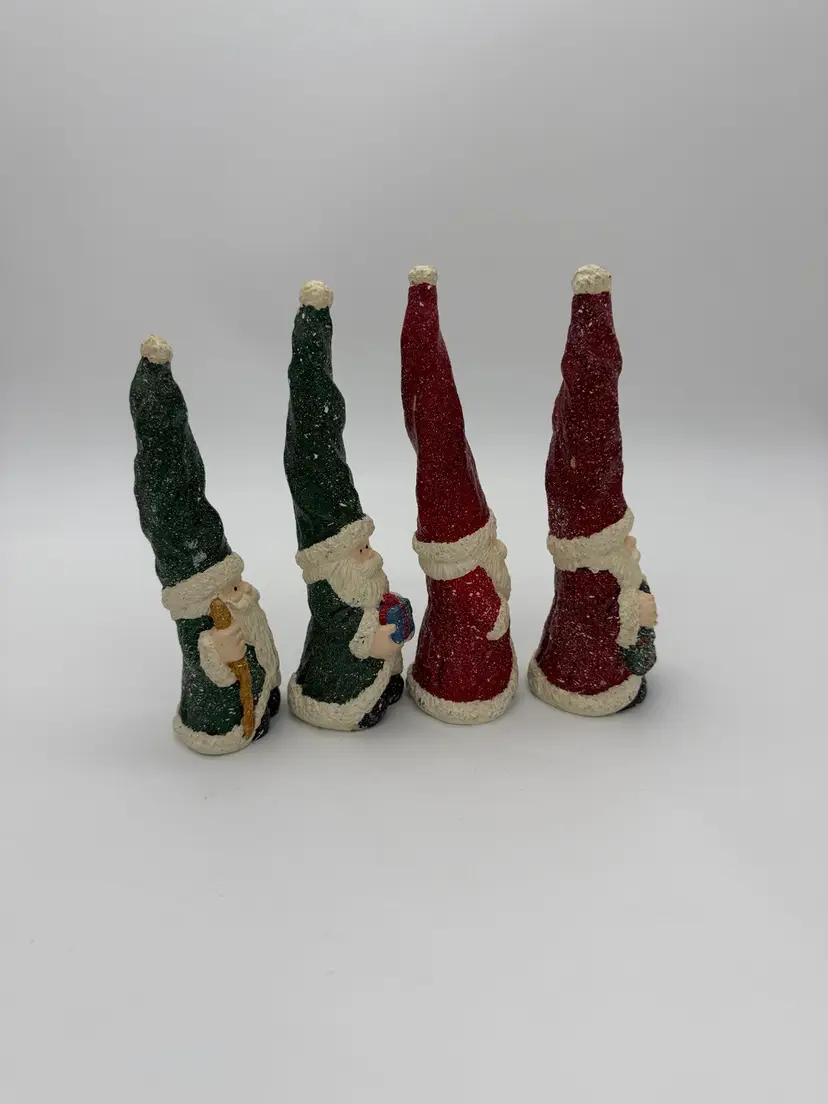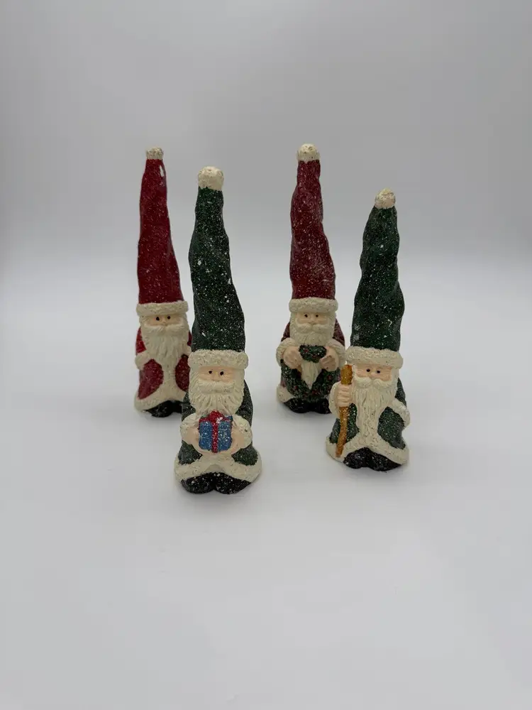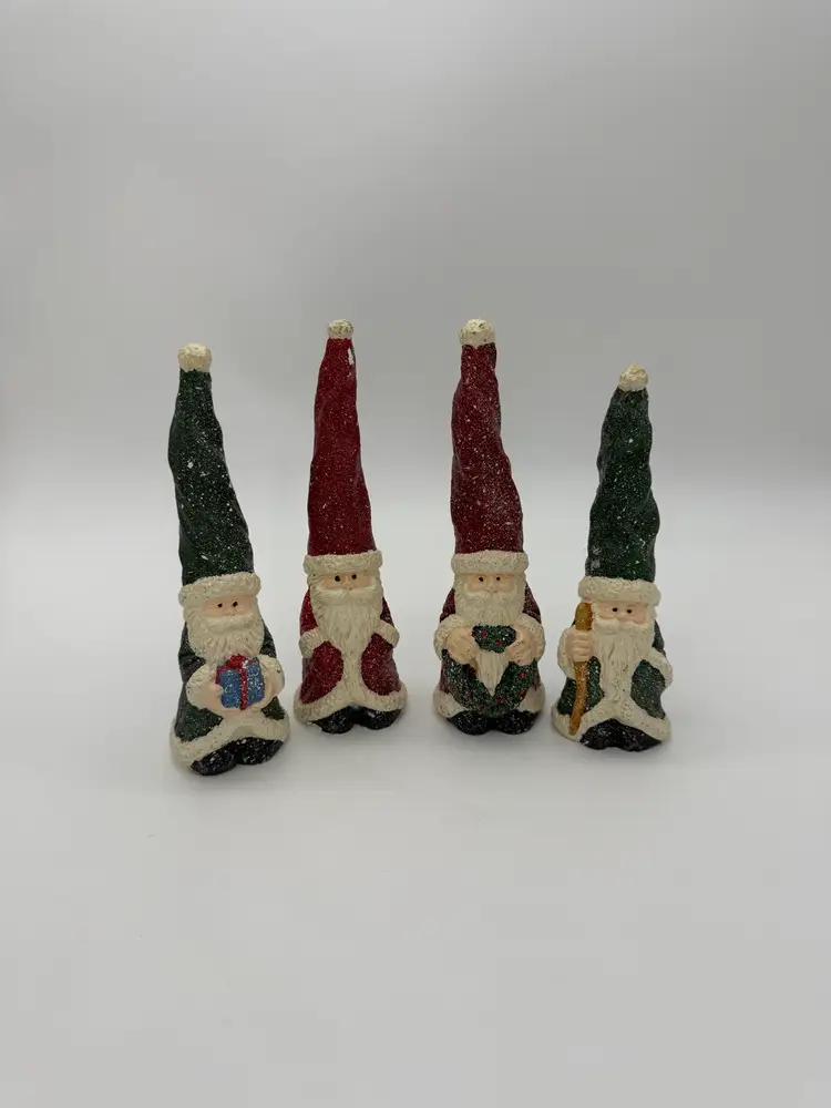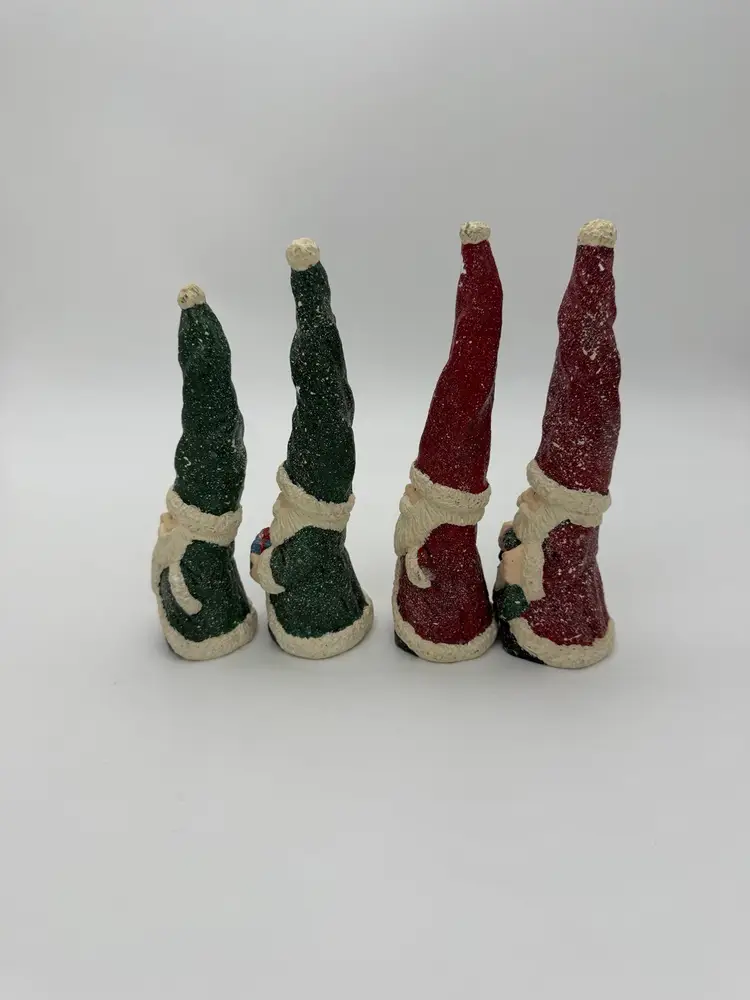This product is a set of 4 vintage red and green Christmas Santa Gnome figurines. Each gnome has a Santa Claus character and is shaped like a gnome. They are made of resin and are hand-painted with a speckled snow and matte finish. These small-sized figurines are perfect for adding a festive touch to your holiday decor, both indoors and outdoors. The retired collection features all-over painted patterns in a Christmas theme, making them a charming addition to any holiday display. Various sizes from 6”-7” tall and 2” wide.