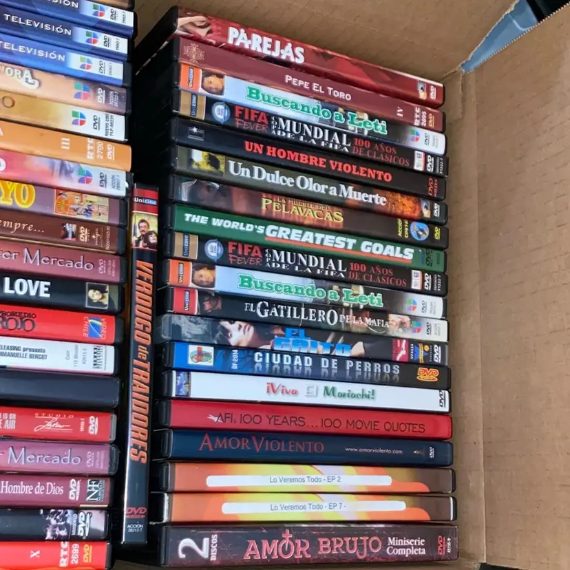 The DVDs are in used condition. Most of the DVDs are in Spanish and there will be a few English ones.